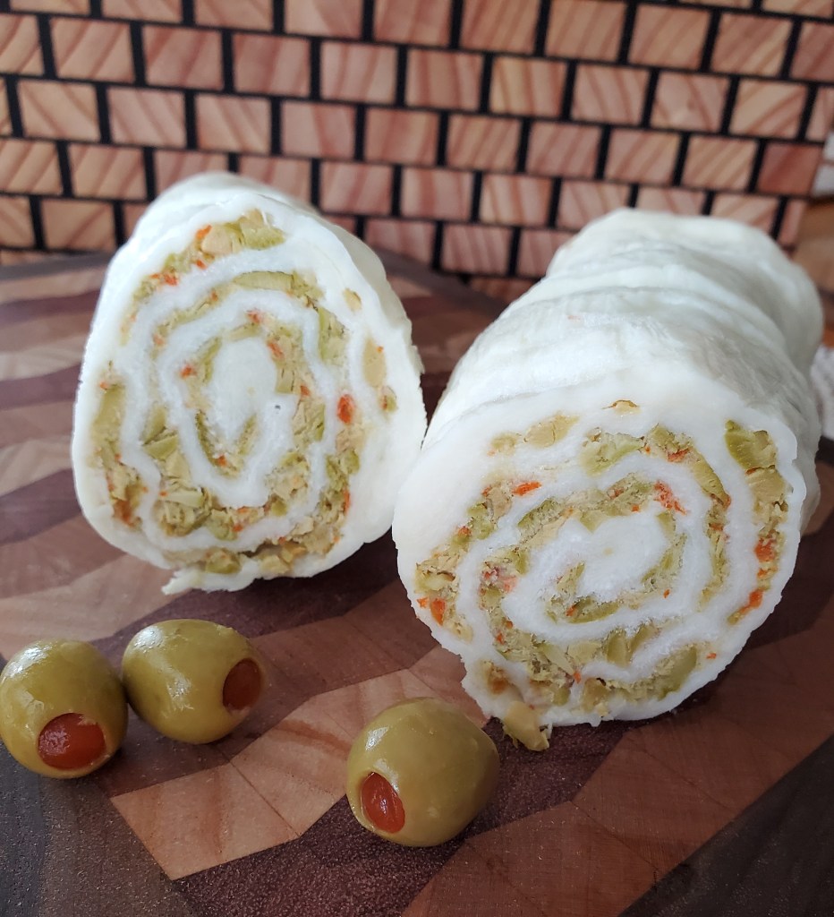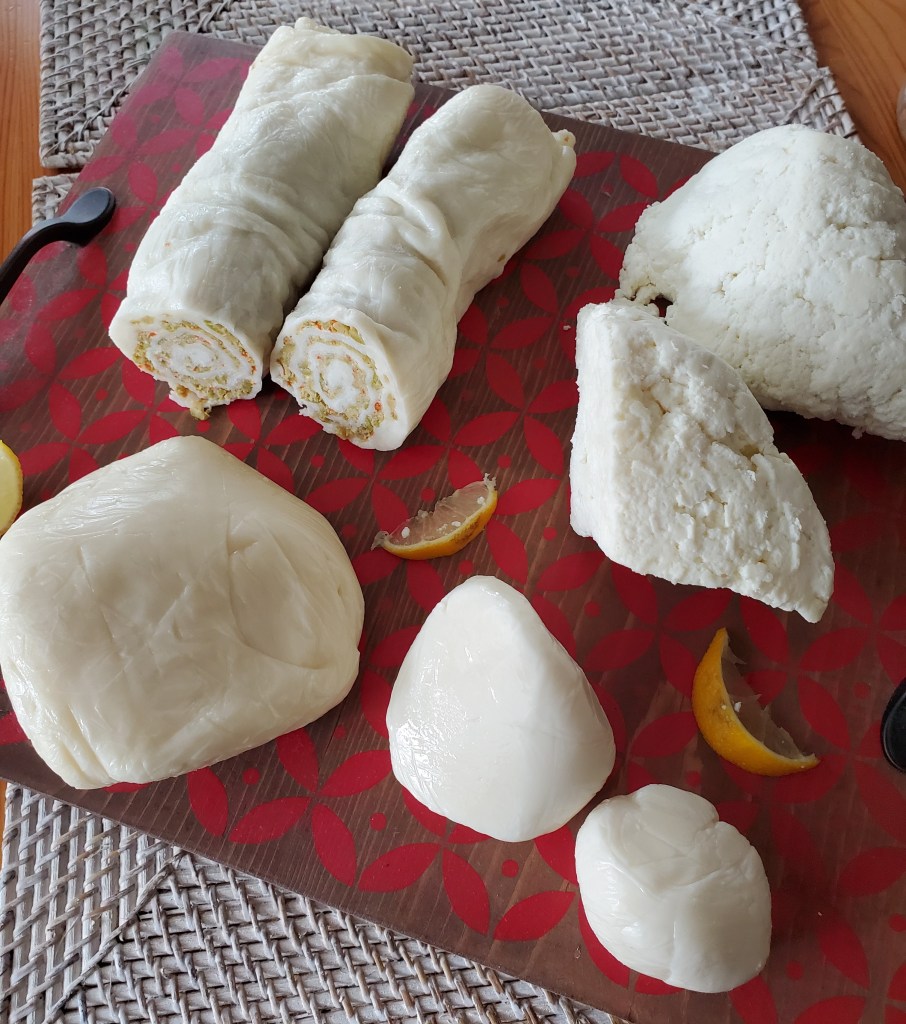 Lastly, we made a mozzarella roll stuffed with olives. We began with the same technique but patted this cheese out flat, like a pizza dough. We then spread a layer of chopped olives evenly over the cheese before rolling the cheese into a tight “log” form. This was wrapped tight in plastic wrap and chilled for us to take home later. I must confess, it was delicious!