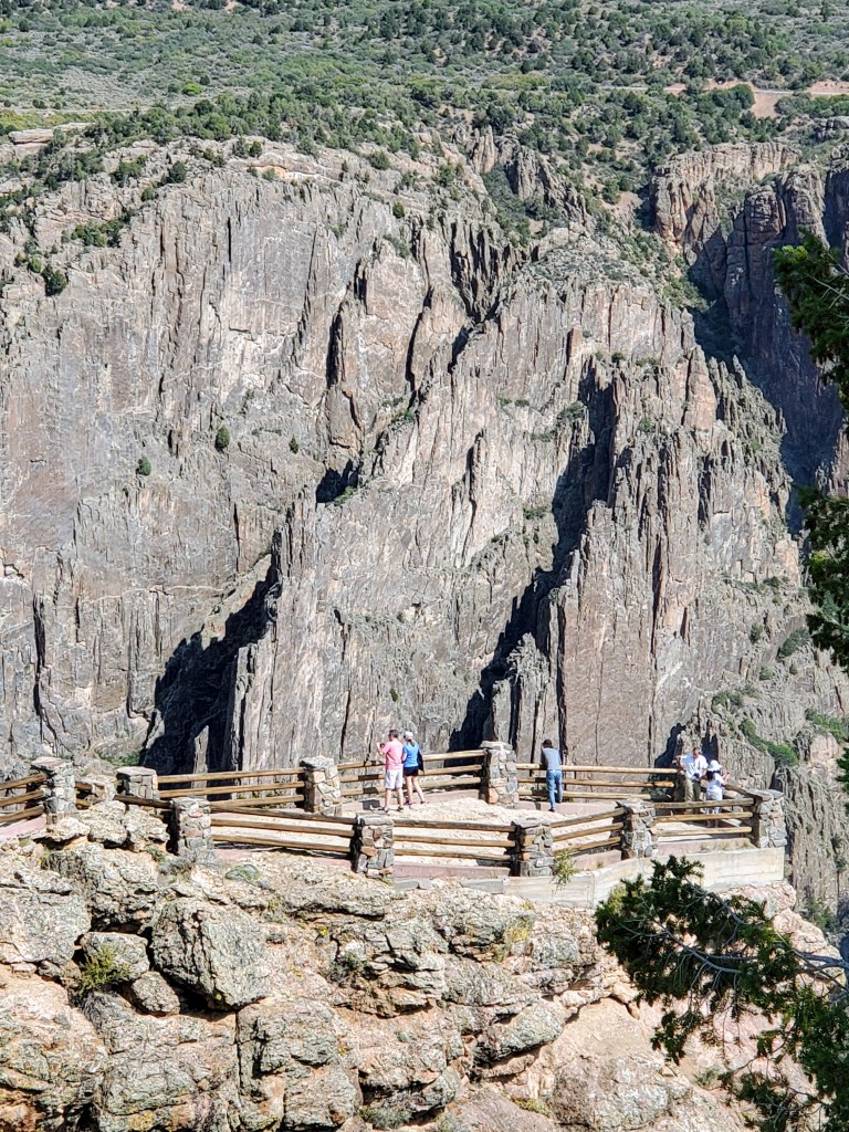 At Dragon Point, the Painted Wall was across the gorge from us and far below was the Gunnison River. The river actually looked very curvy and small from our vantage spot so high above. Our view was quite deceiving. The Gunnison River actually drops an average of 43 feet per mile through the canyon, which is six times more than the Colorado River through the Grand Canyon – just to put it in perspective.