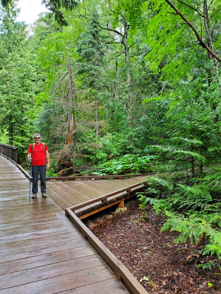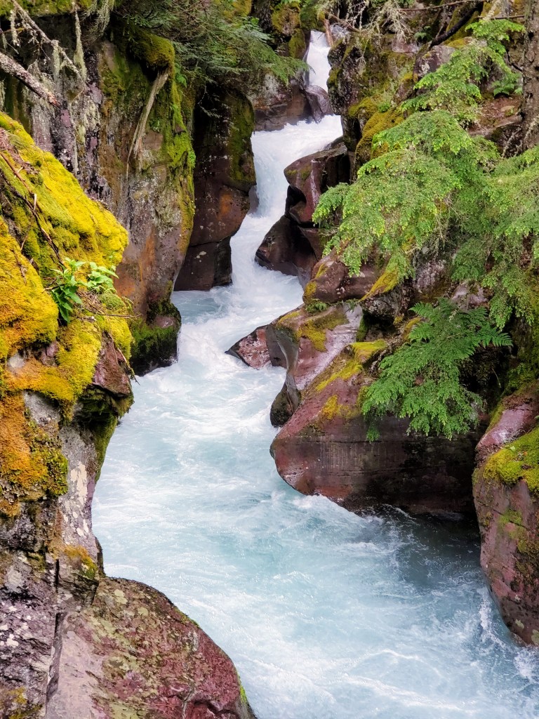Day #1 – We drove through the West Glacier entrance that morning and headed to Lake McDonald, the largest lake in the park. We explored the historic Lake McDonald Lodge (built in 1914) and grounds before taking a boat ride on the beautiful lake. After a picnic lunch, we drove the Going-to-the-Sun Road and stopped at several turn-outs to view McDonald Creek and the amazing scenery along the way. Mid-afternoon, we parked and hiked The Trail of the Cedars. This was one of our favorite hikes! The trail was a raised boardwalk or gravel trail that winds its way through a thick forest of towering cedar trees. The highlight for us was the view of Avalanche Gorge from the trail with its turquoise water tumbling down colorful moss-covered rocks. The damp weather made it feel like we were exploring a rainforest. Even though it was a drizzly afternoon, nothing could take away from the beauty of this trail. We loved it!
