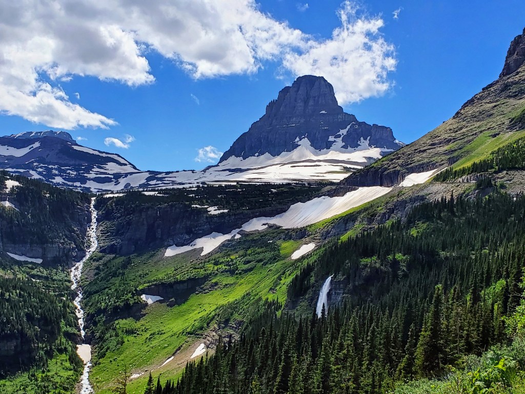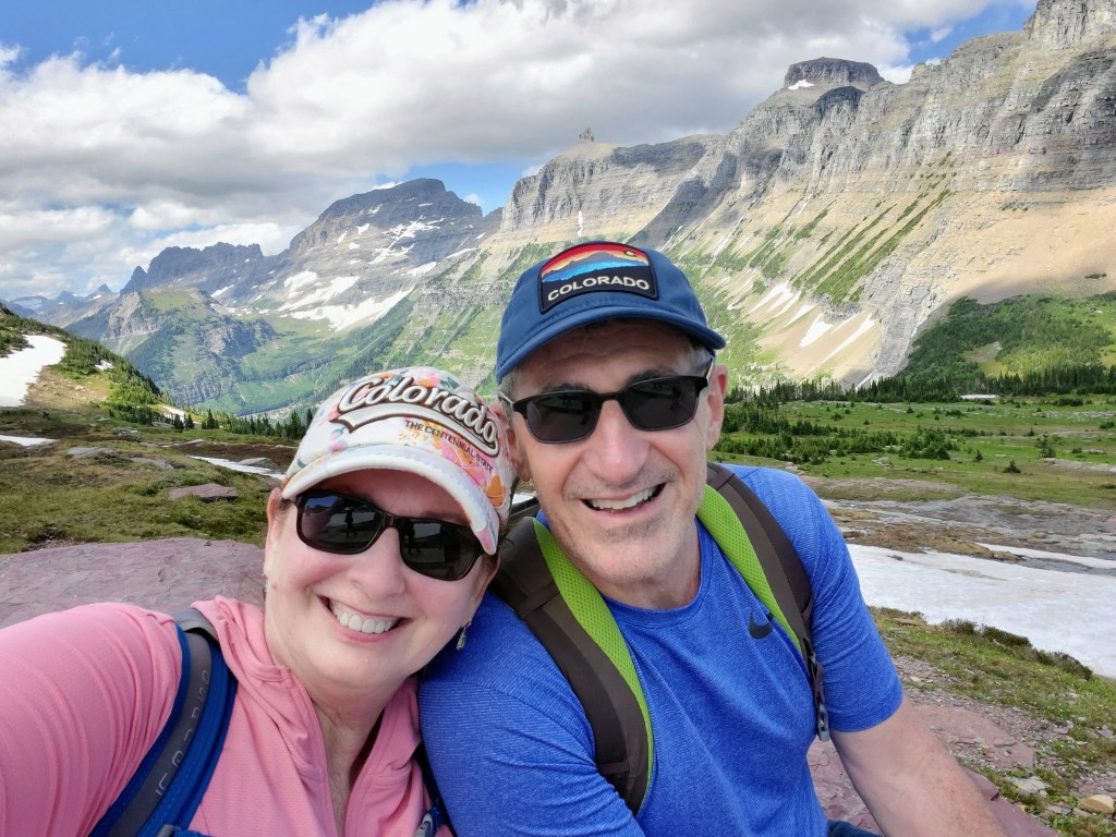 Day #2 – We got an early start and drove east to the park’s St. Mary’s entrance. We had a morning boat ride scheduled on beautiful St. Mary’s Lake that included a hike to a waterfall. It was a gorgeous day and we enjoyed our morning adventures. David and I found a little restaurant nearby in the park and had a great lunch (huckleberry pulled pork stuffed baked potatoes!) and continued our drive on The Going-to-the Sun Road with a few scenic stops along the way. We found ourselves at Logan Pass that afternoon, the highest point of the Going-to-the-Sun Road (6646 feet) and located along the Continental Divide. The road in this area had only opened 4 days prior to our visit due to the difficulty of snowplowing such late, heavy snows. The scenery at this high elevation was amazing! We parked and hiked the Hidden Lake Trail as far as we could but it was quite difficult with the packed, icy snow underfoot. Seeing all the snow, the jagged mountains, fields of wildflowers, waterfalls, marmots, ground squirrels, and big horn sheep made for a very memorable afternoon and gave us some great photo ops!