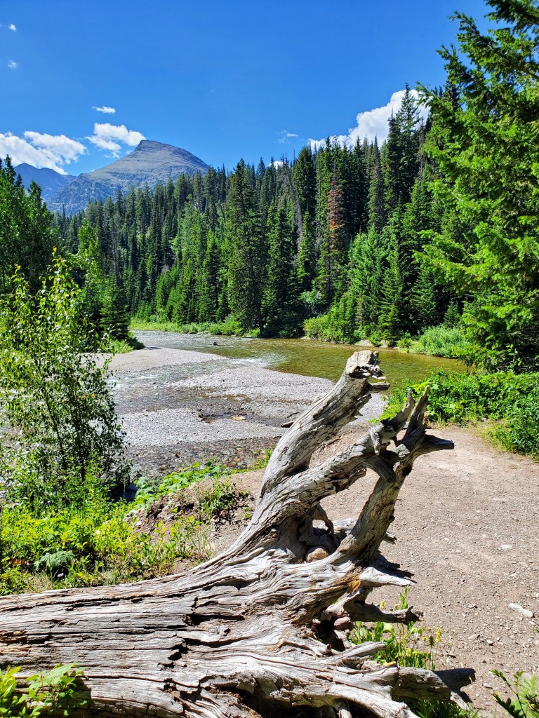 I found us a great little Vrbo rental in Essex, Montana that bordered the southern edge of the park, perfectly located about halfway between the west and east entrances to the park. The cabin was clean, cozy, comfortable and well-stocked. We cooked breakfast each morning, packed up our picnic lunch, went on our daily adventure, and returned each evening to cook/grill our dinner. A large mule deer welcomed us on our very first morning and a mink and chipmunks scampered around near our firepit each day. We had found a great little “home away from home.”