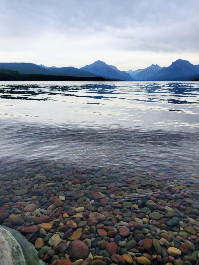 Day #5 – We woke to another cloudy, drizzly day but decided not to let it stop our exploring. We headed back to West Glacier and spent the day at Apgar Village on the shores of Lake McDonald. We walked the shoreline, snapped a few iconic “colored rock” photos, hiked a wooded trail, shopped in the gift stores, and enjoyed coffee/lunch/huckleberry ice cream during the hours we spent there. It was a very relaxing day. On the way back to our cabin, we stopped at the Goat Lick overlook to see a herd of mountain goats that hang out on some rocky cliffs. We saw several of them!