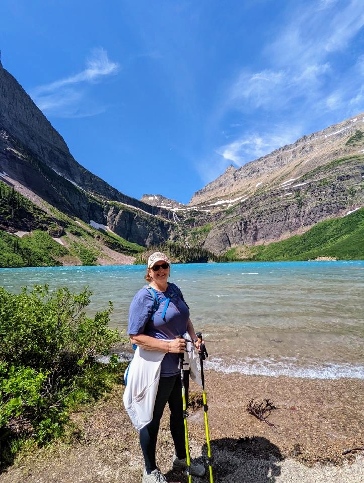 selfie at Lake JosephineLake Josephine with Salamander Glacier and Grinnell Glacier in background