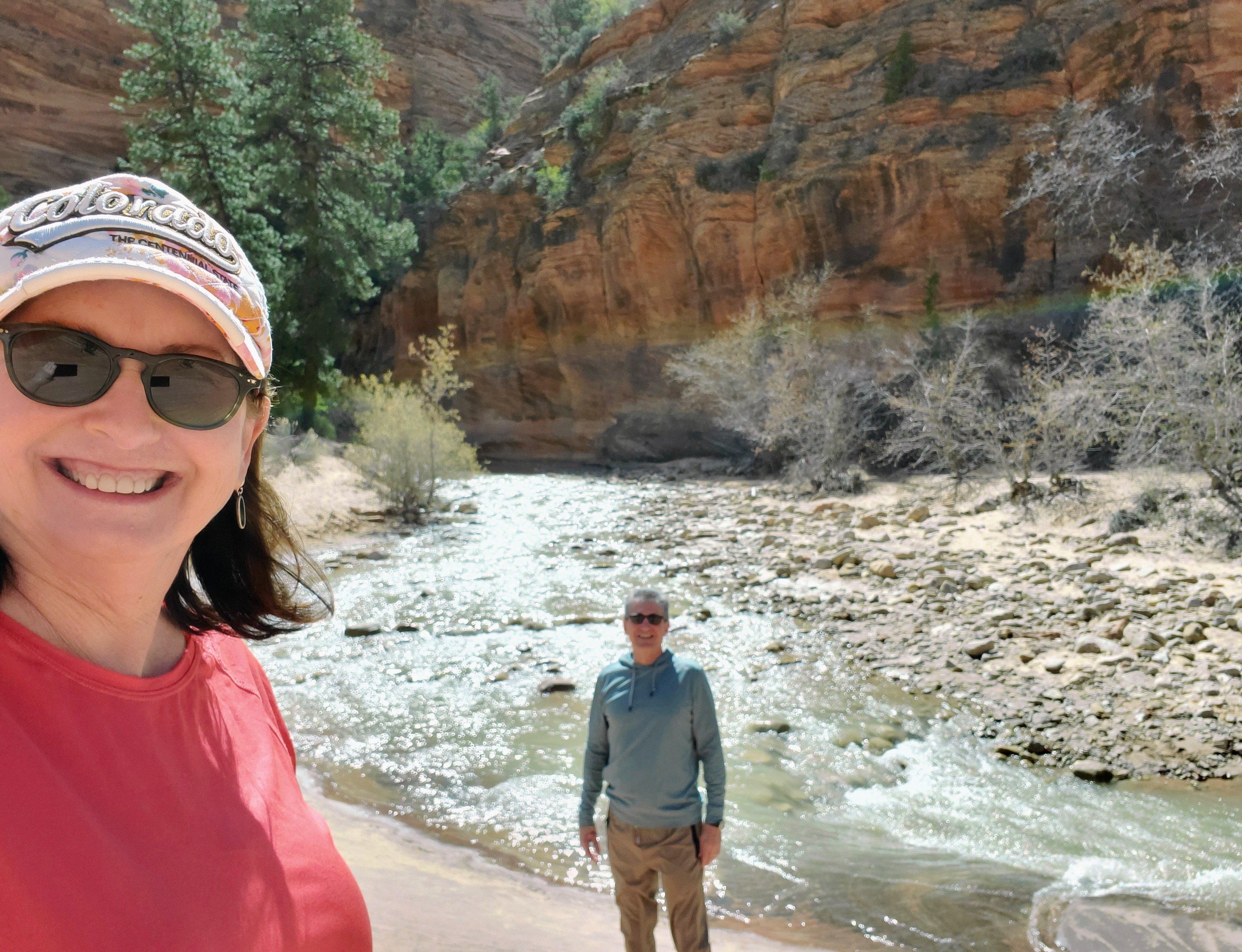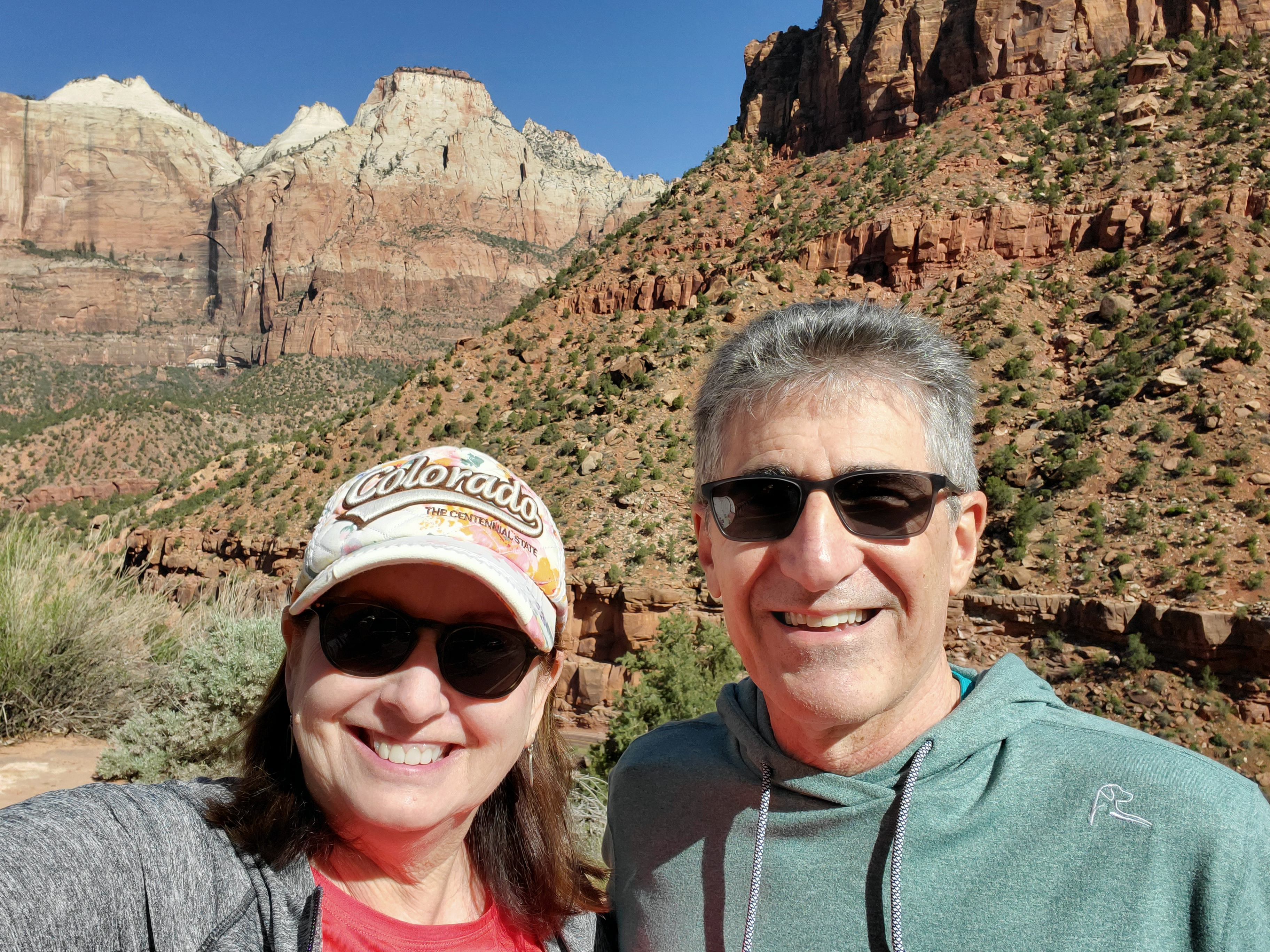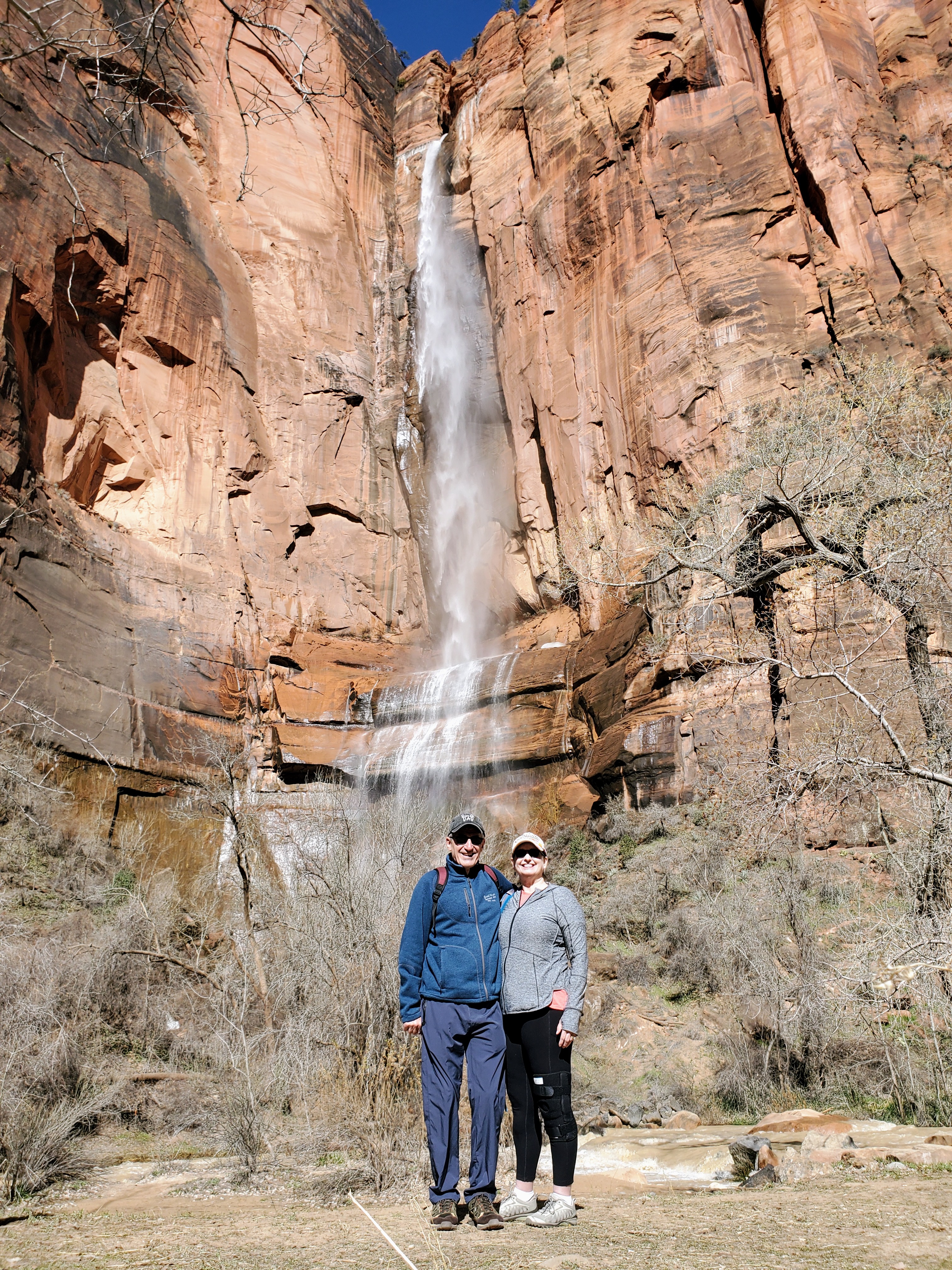 David and I entered the park early on our first full day. No lines! We decided to ride the shuttle all the way to the final stop and work our way backwards. We hiked approximately 7 miles the first day and saw many beautiful sights. We hiked paved, sandy, rocky, forested and dirt trails. We saw mule deer, beautiful waterfalls, clear pools, bridges, sandy beaches, ancient trees, mountain ranges and towering cliffs. We ate a leisurely lunch, snacked on ice cream and shopped at The Zion Lodge gift shop. Quite simply, we had the perfect day. We slept like logs that night!
