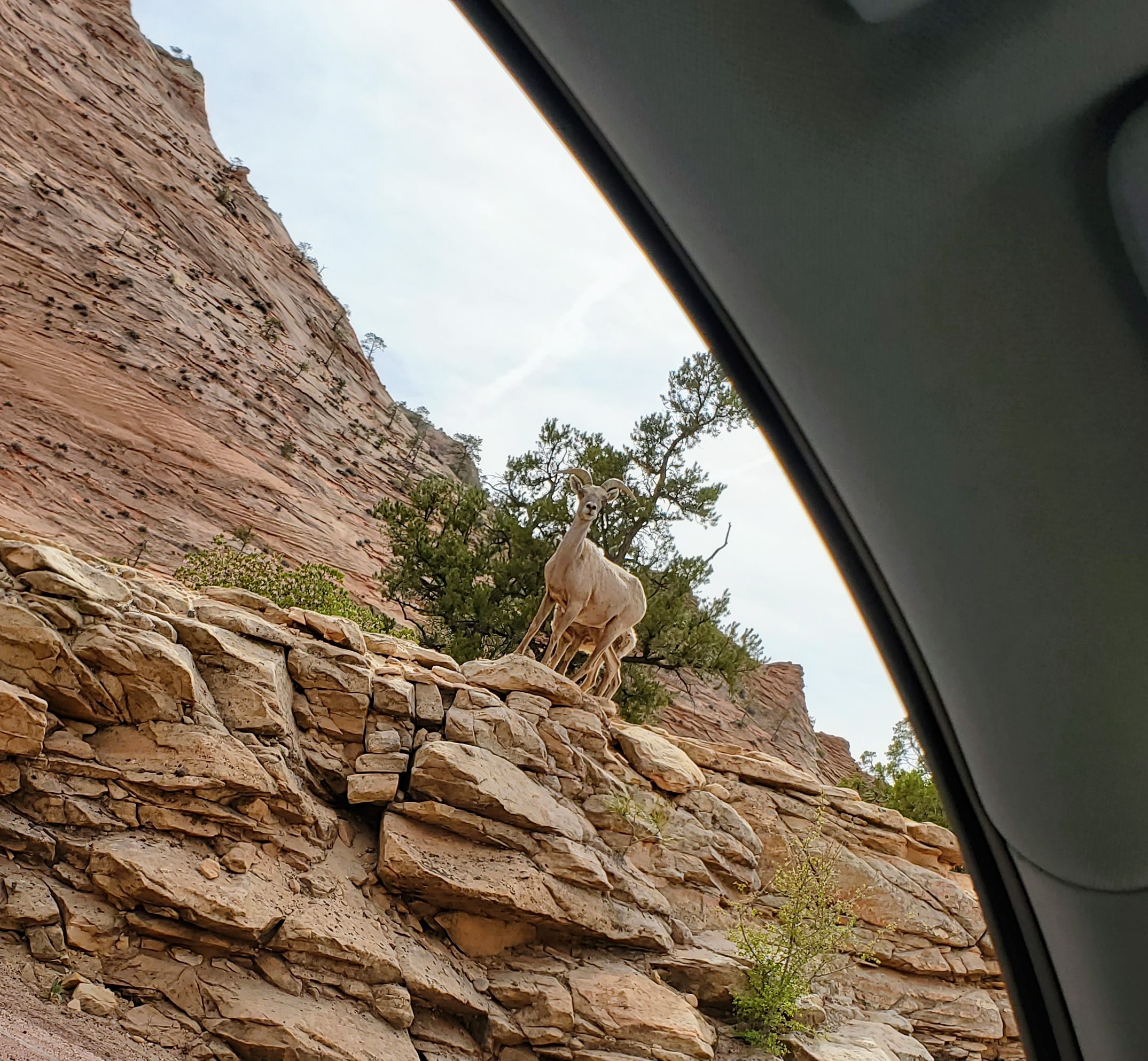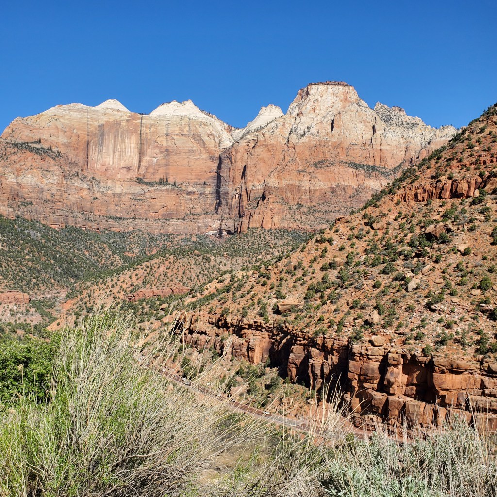 The second day in the park, we drove the Zion-Mount Carmel Highway to Zion’s east entrance. This scenic highway has a tunnel, hairpin switchbacks, elevation changes and great views of Zion. It runs north/northeast and leads to Bryce Canyon or The Grand Canyon . This was a stunning drive with plenty of eye candy. There are many pull-offs, lookouts, parking areas and a few trailheads to stop and explore along the way. This route took us through the mile-long Zion-Mt. Carmel Tunnel, a modern engineering marvel for its time. We enjoyed walking along a sandy bank of the Virgin River, seeing bighorn sheep, and “checking” out the impressive Checkerboard Mesa.