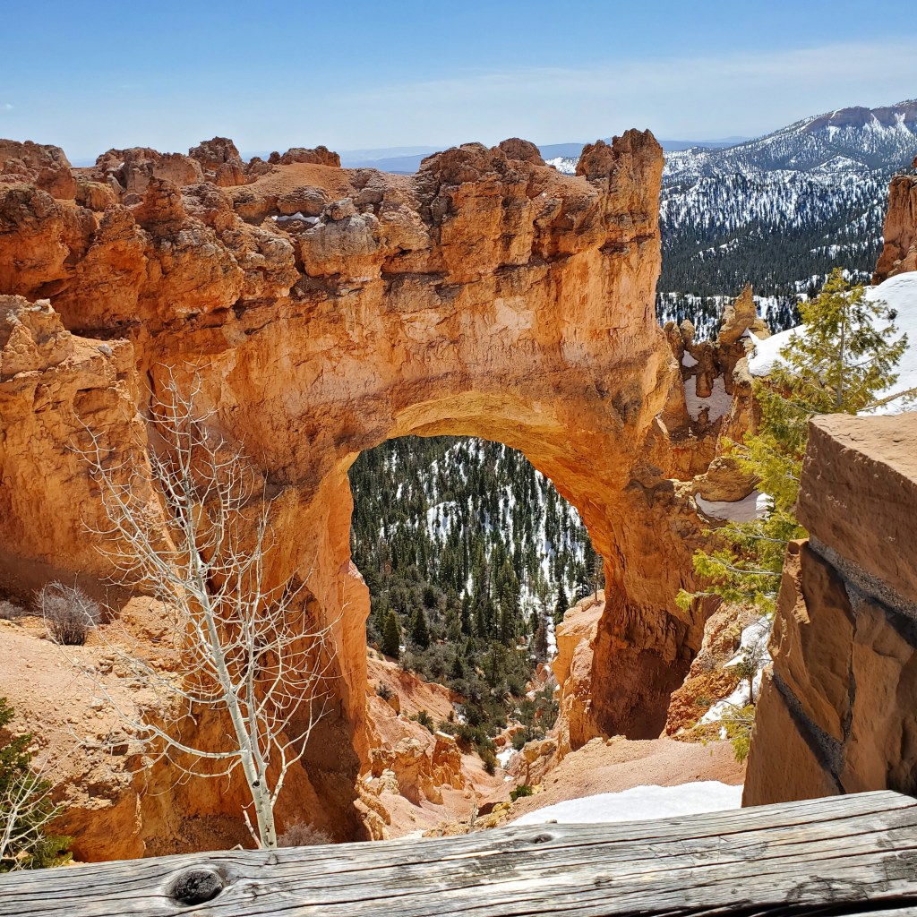 We left from the Visitor’s Center and decided to drive the Bryce Canyon Scenic Drive to the farthest point and work our way back to the park entrance. The route runs 18 miles (one way) to Rainbow Point. Unfortunately, with all the late and heavy snows, the road had not been snowplowed to that point and we could only go as far as the Natural Bridge Overlook. Our first official views of Bryce Canyon were at Natural Bridge and they did not disappoint. Wow!