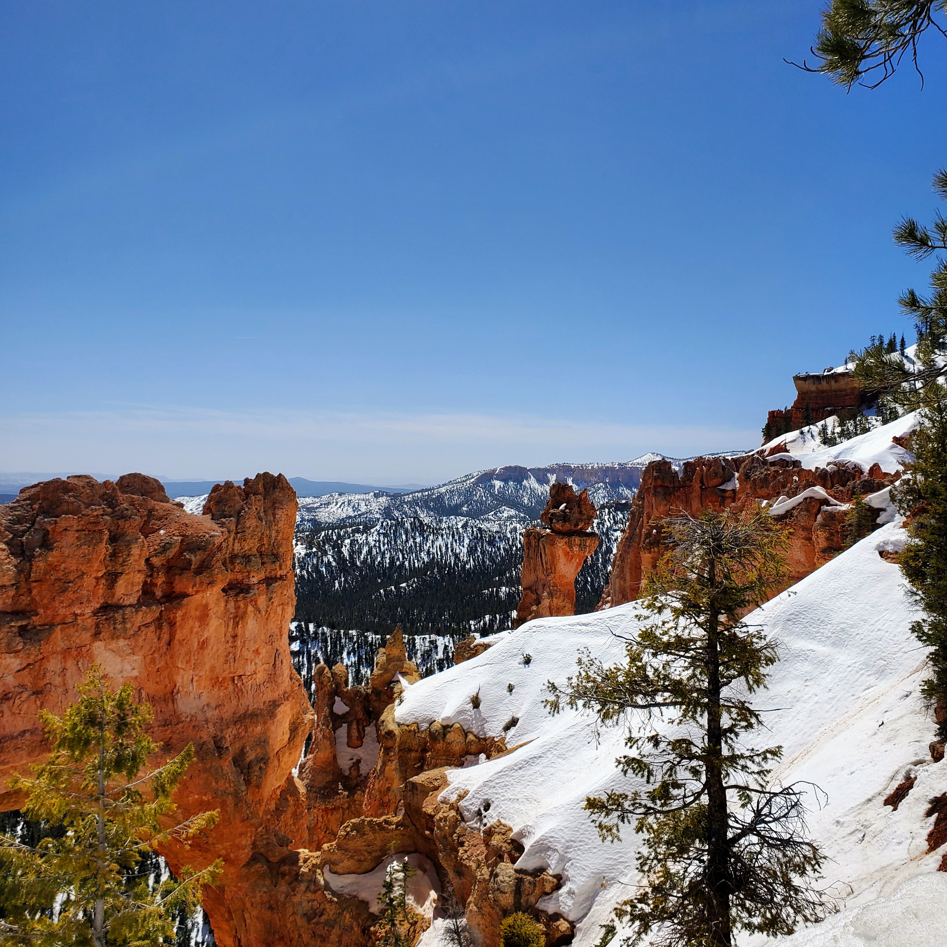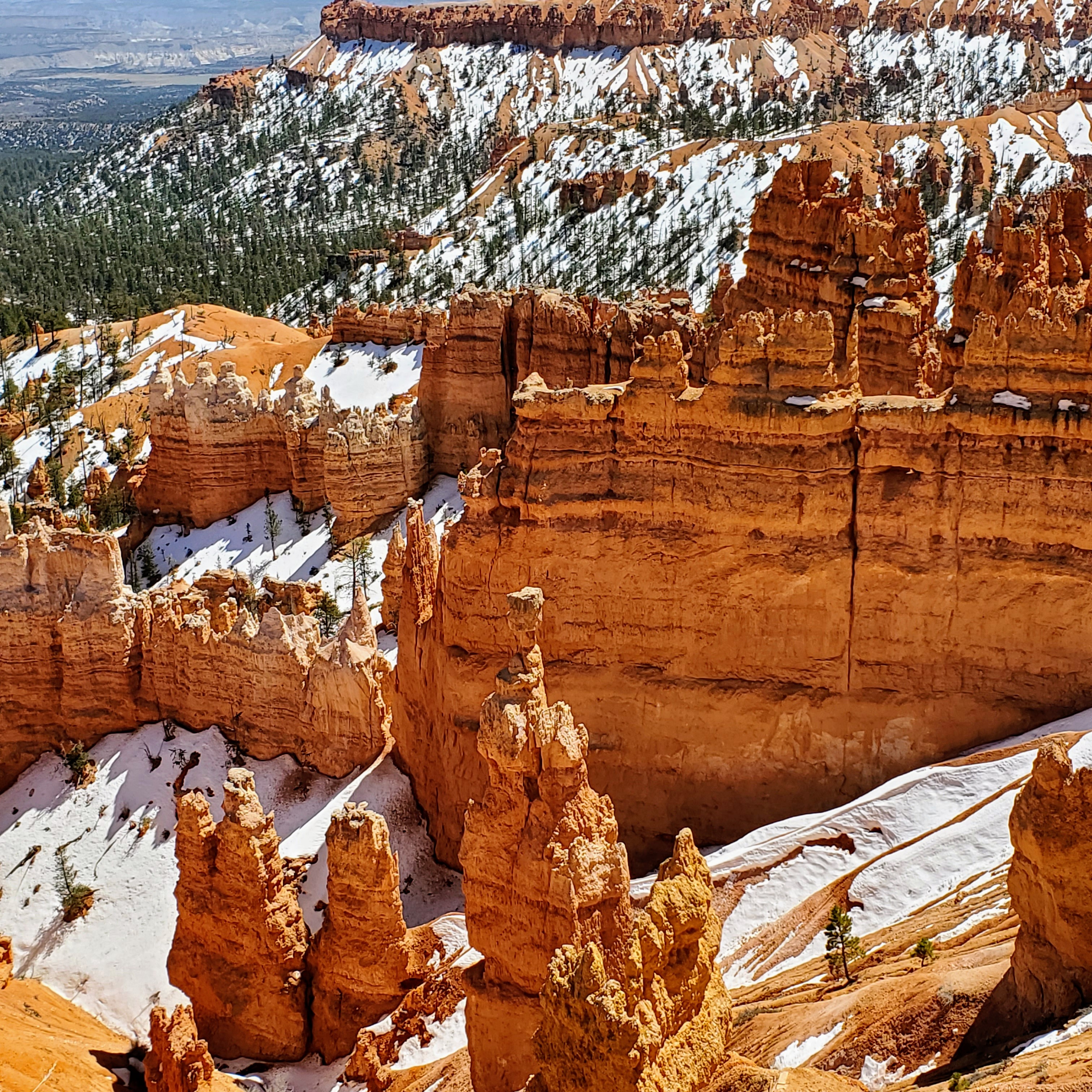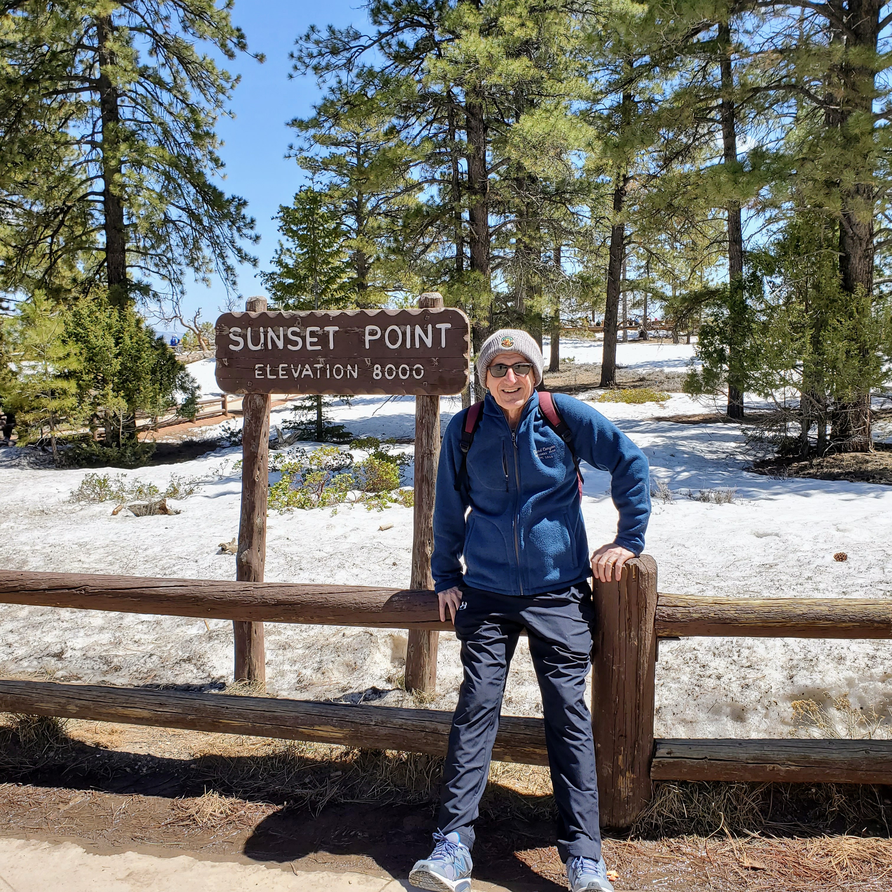 The canyon rim along these overlooks sits at an elevation around 9,000 feet. This particular day was clear and sunny with warm temperatures. The elevation and light winds made it feel much cooler than expected. Snow still covered much of the park (especially in shadows) and many trails were closed due to icy conditions. It was easy to see why the high altitude and cool temps make Bryce a prime vacation spot in the heat of the summer months.
