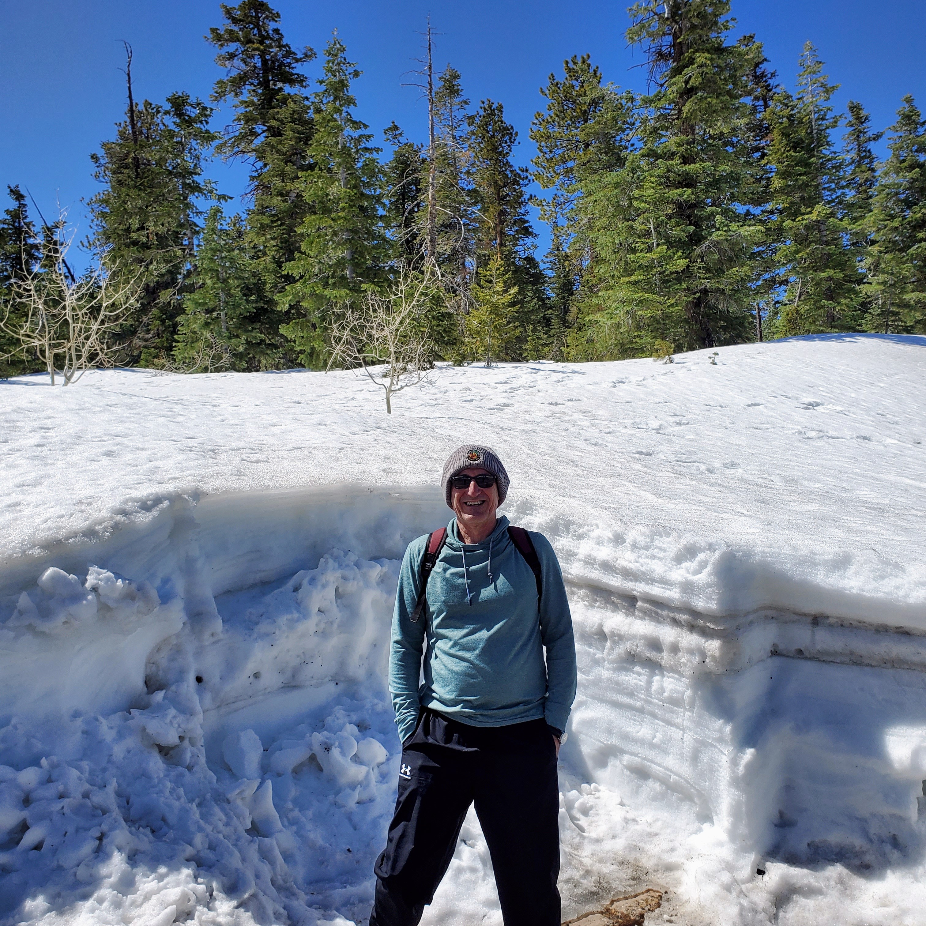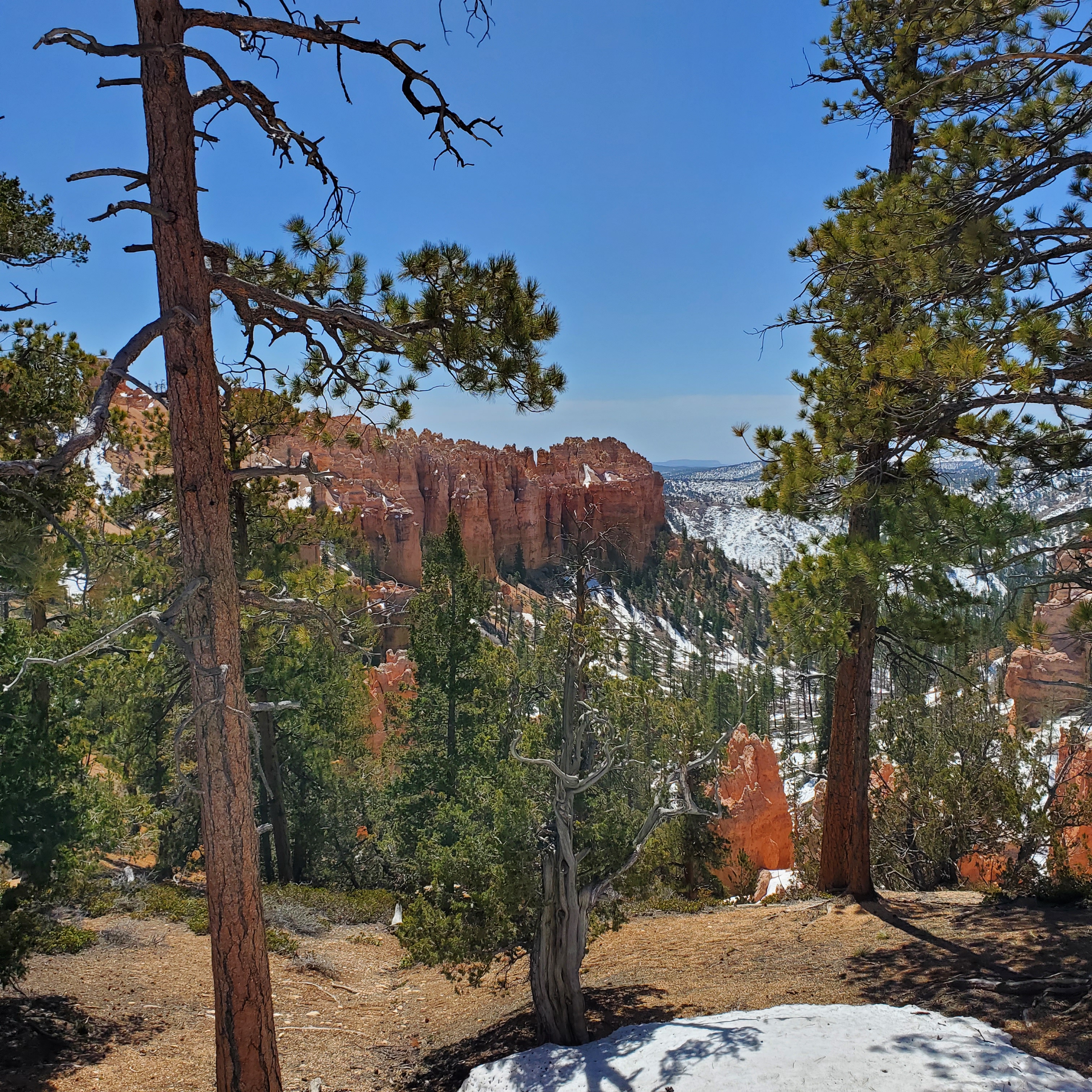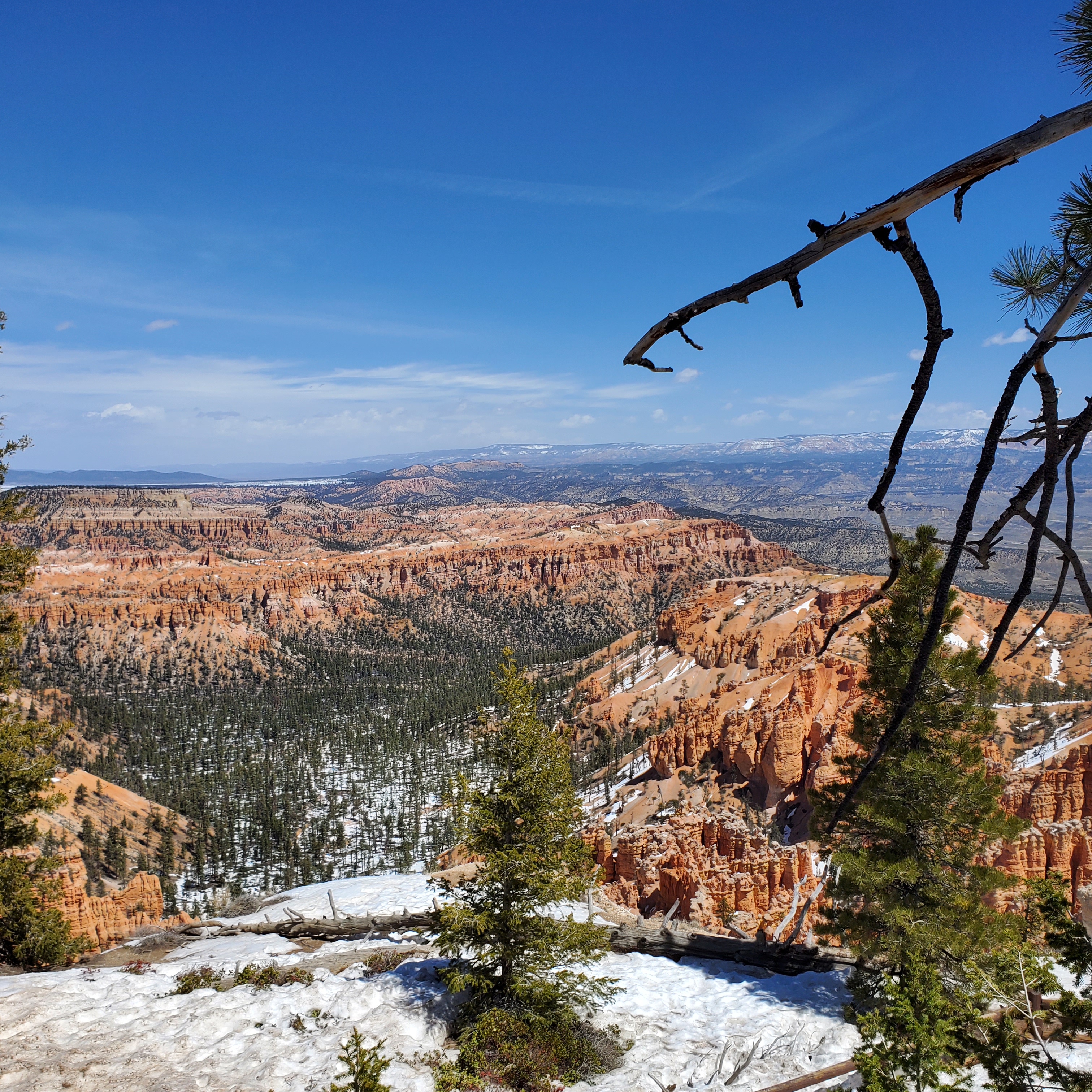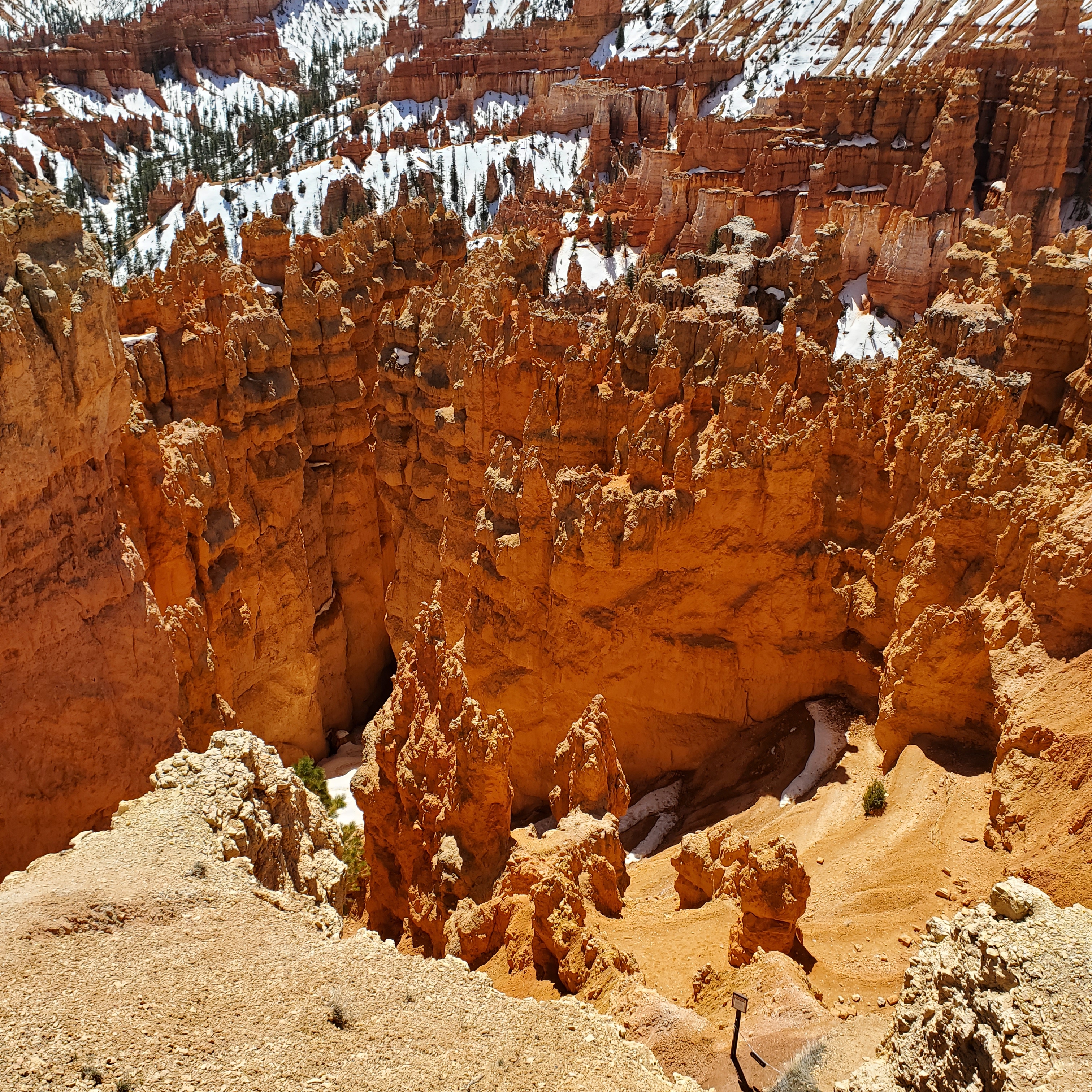 The canyon rim along these overlooks sits at an elevation around 9,000 feet. This particular day was clear and sunny with warm temperatures. The elevation and light winds made it feel much cooler than expected. Snow still covered much of the park (especially in shadows) and many trails were closed due to icy conditions. It was easy to see why the high altitude and cool temps make Bryce a prime vacation spot in the heat of the summer months.