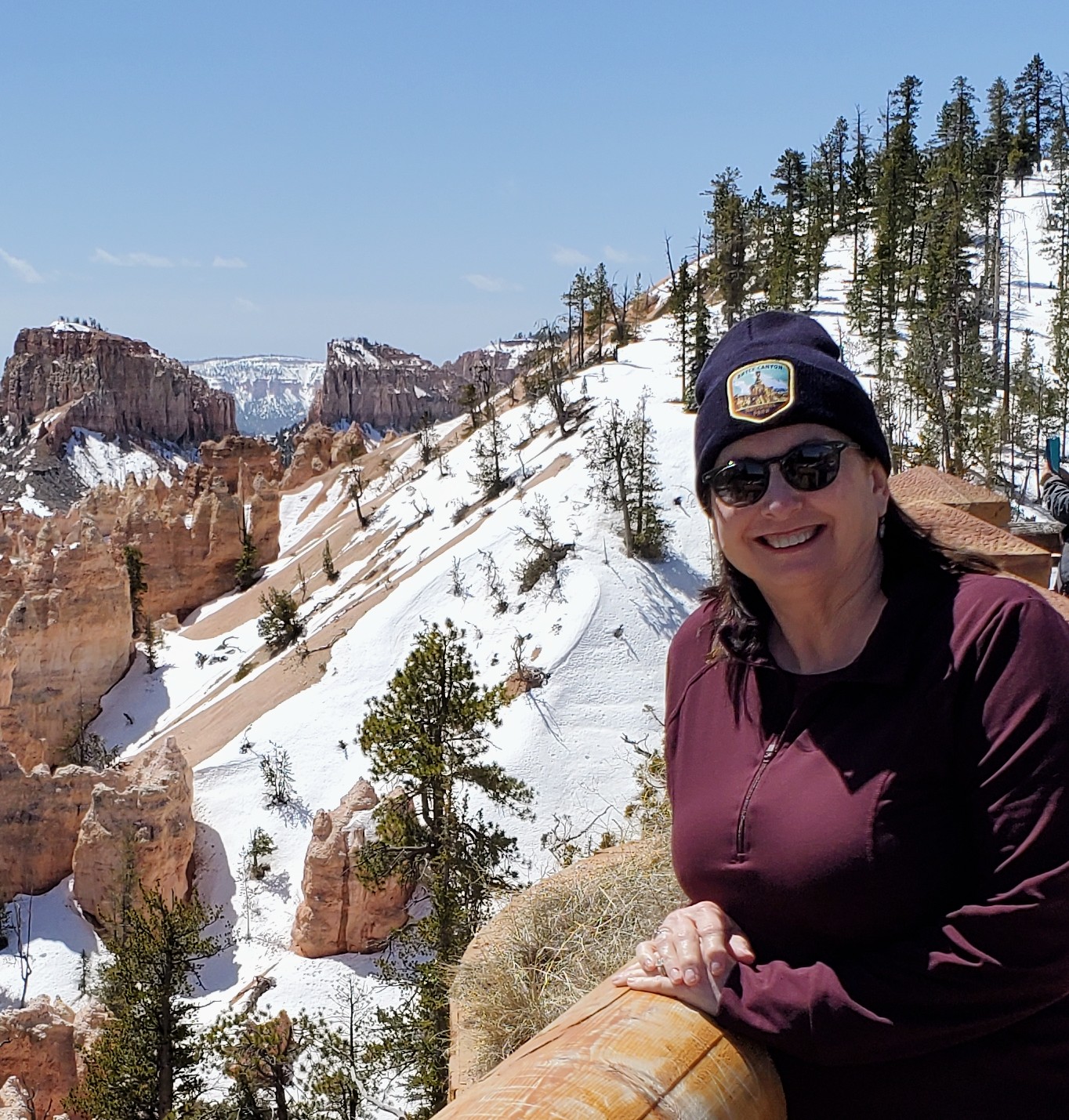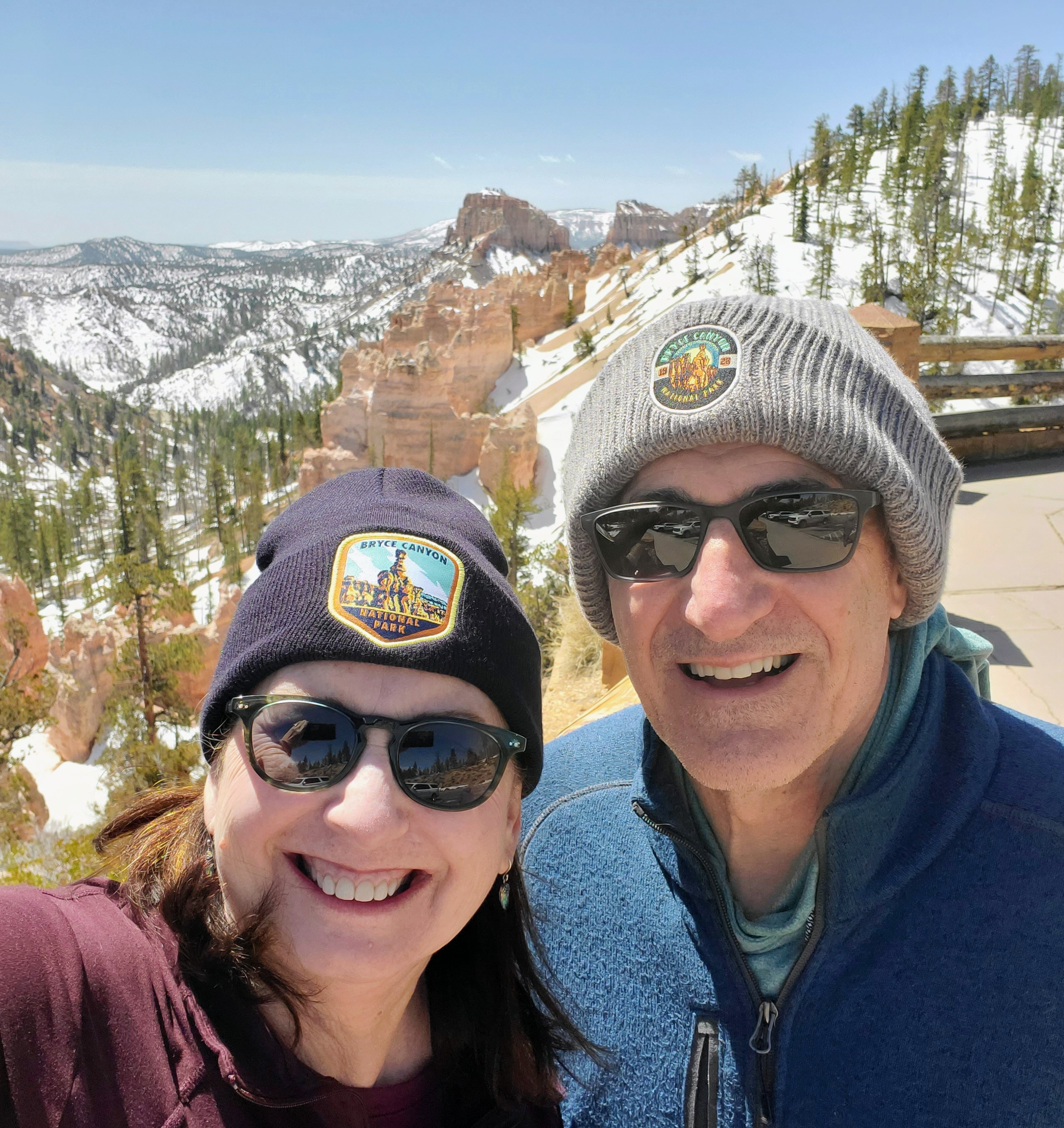 We arrived at the park entrance mid-morning and our first stop was the Bryce Canyon Visitor Center. We learned of the road and trail closures (due to snow/ice), picked up maps, and bought souvenirs. David and I seem to have a habit of always underestimating the weather in certain places we visit, whether it is due to altitude, winds or unpredicted cold fronts. It is now a joke with us to see how much money we spend in each park buying hoodies, jackets, hats, etc. for things that we could have easily packed and brought from home, but didn’t. We now have a wide and varied collection of items with many park logos, including our new knit caps from Bryce Canyon. The wind at that altitude was brutal!!