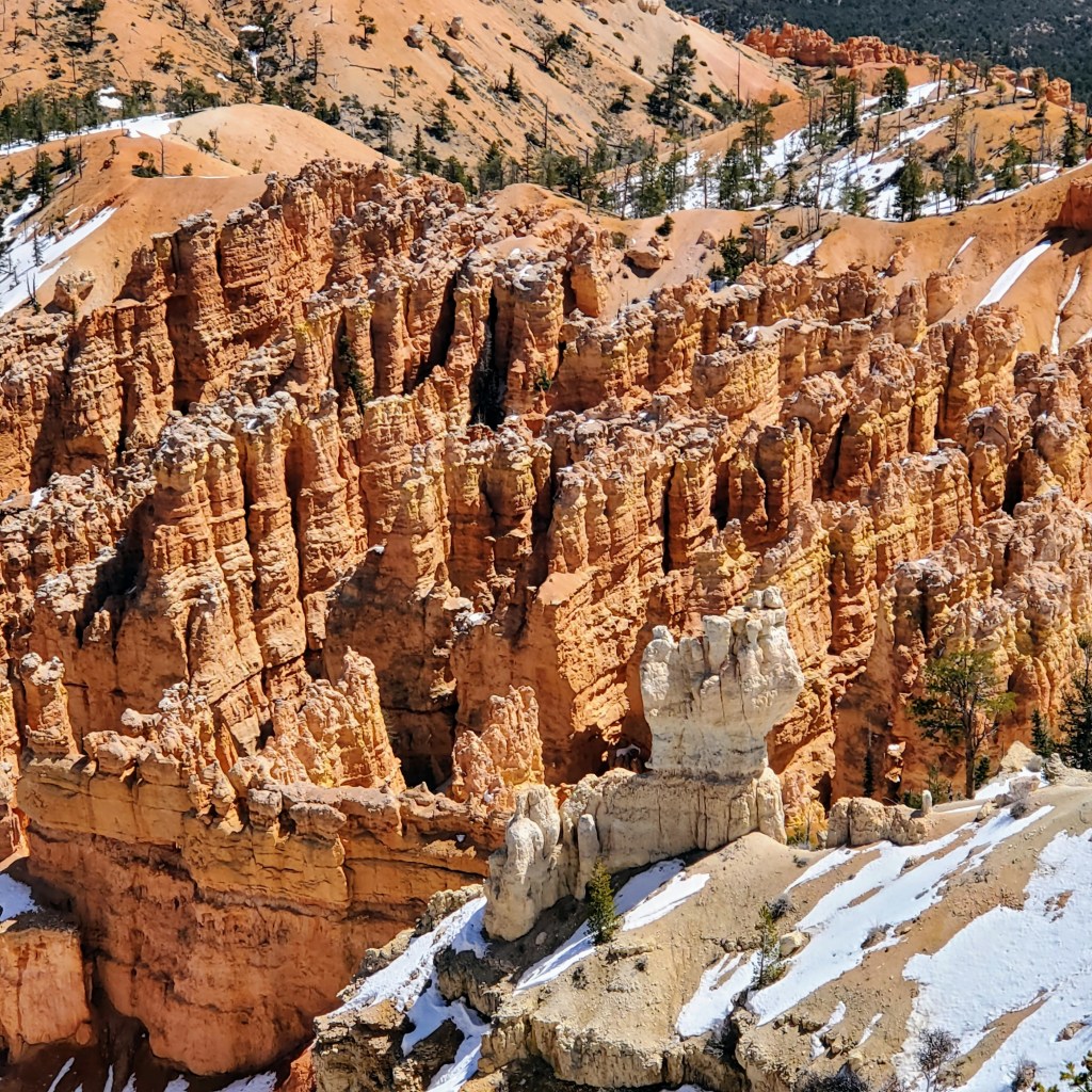 Bryce Canyon was certainly unlike anything that I have ever seen before. The park is filled with red, orange and white towering rock formations known as hoodoos. These spiky limestone “pillars” have been formed by water and wind erosion over millions of years. What we see today seems like something out of a fairytale land or maybe even another planet. Some rock formations appear to be delicate and fragile – others look like strong rock columns that have been stacked by giants. Beautiful, unusual and mesmerizing – all at once. Every view seems different with the sun and shadows constantly changing the colors. When you add in the white sandy hills, the remaining snow drifts and the green tree line in the far distance, the views are truly amazing.