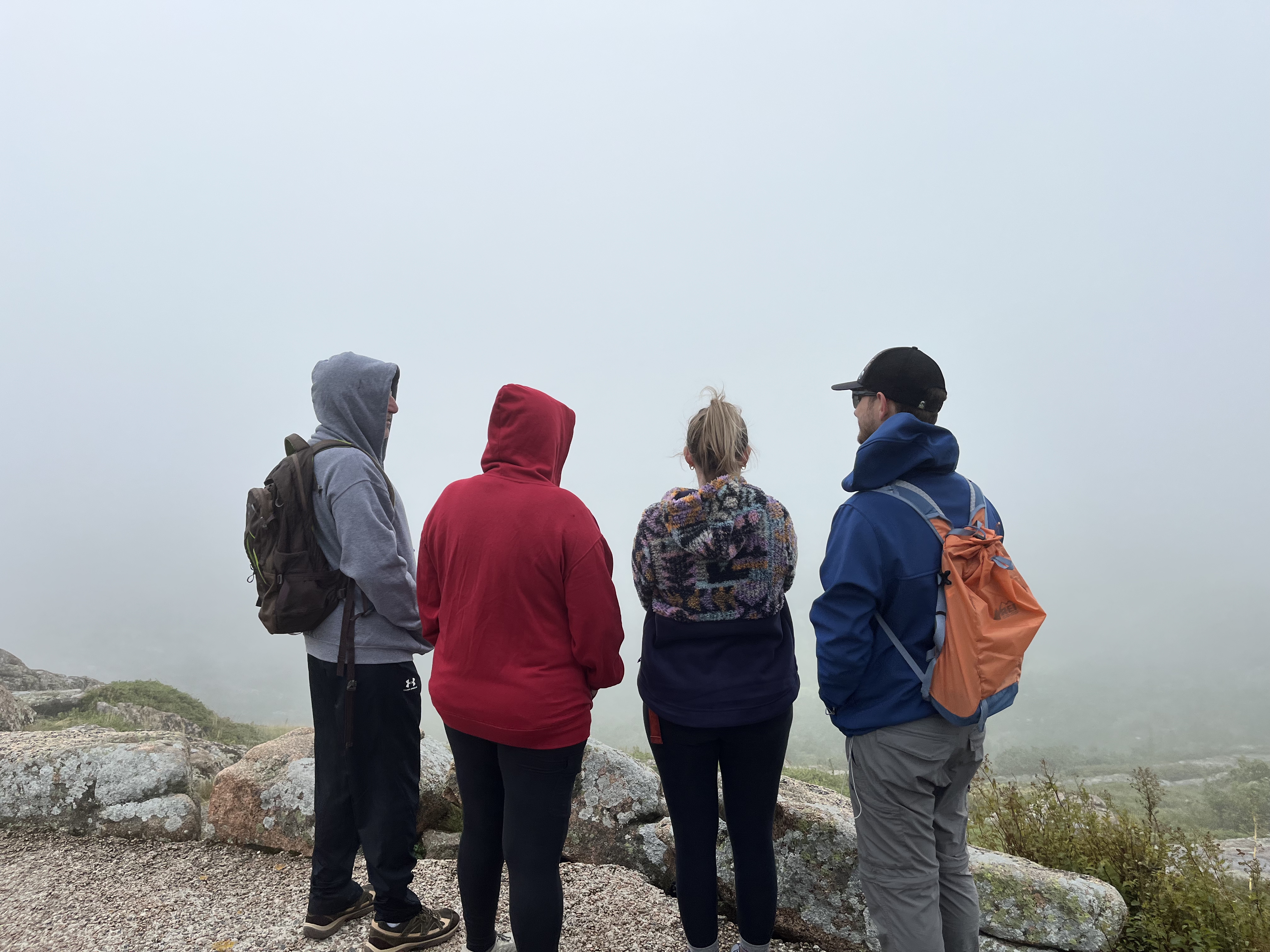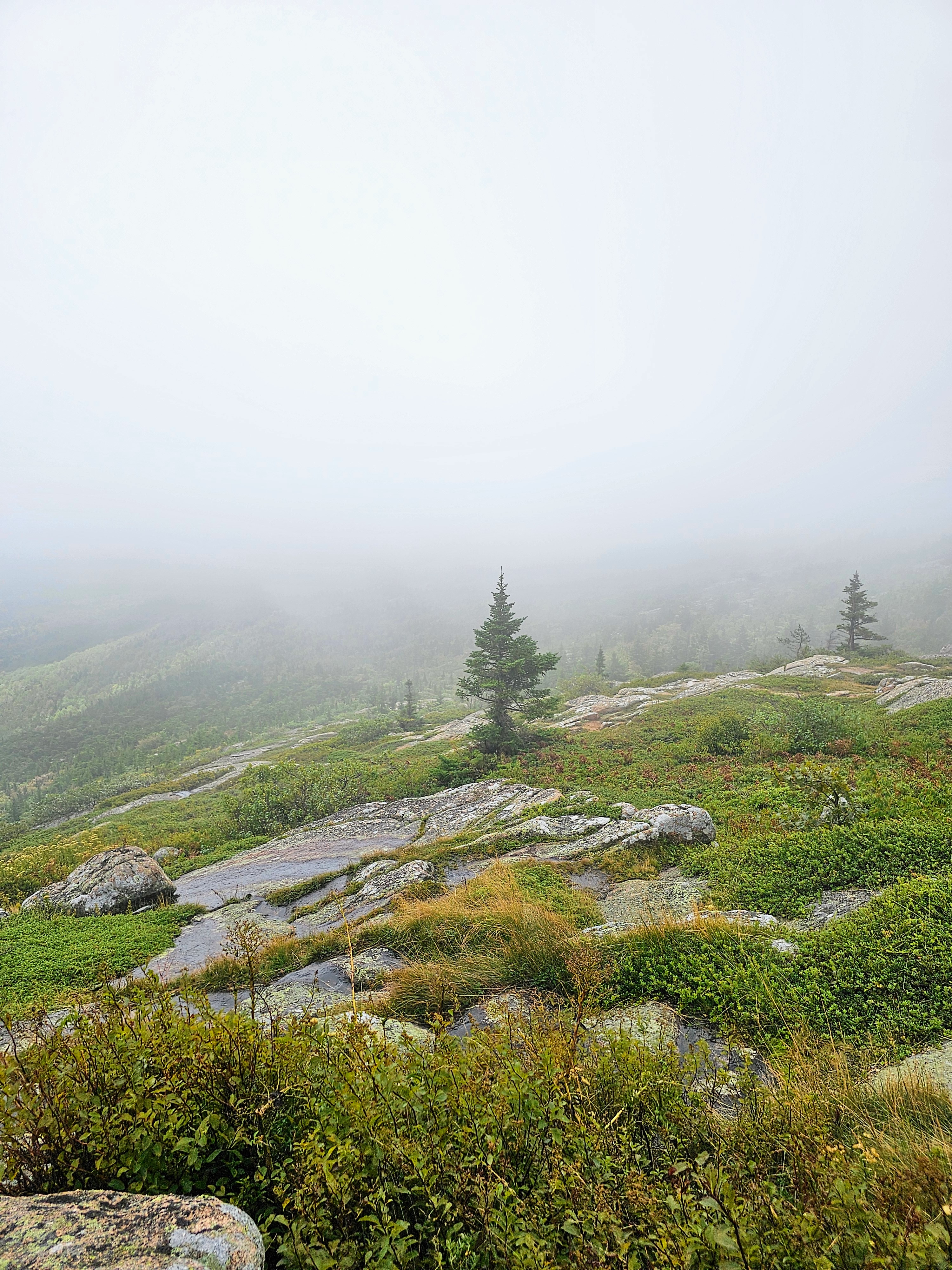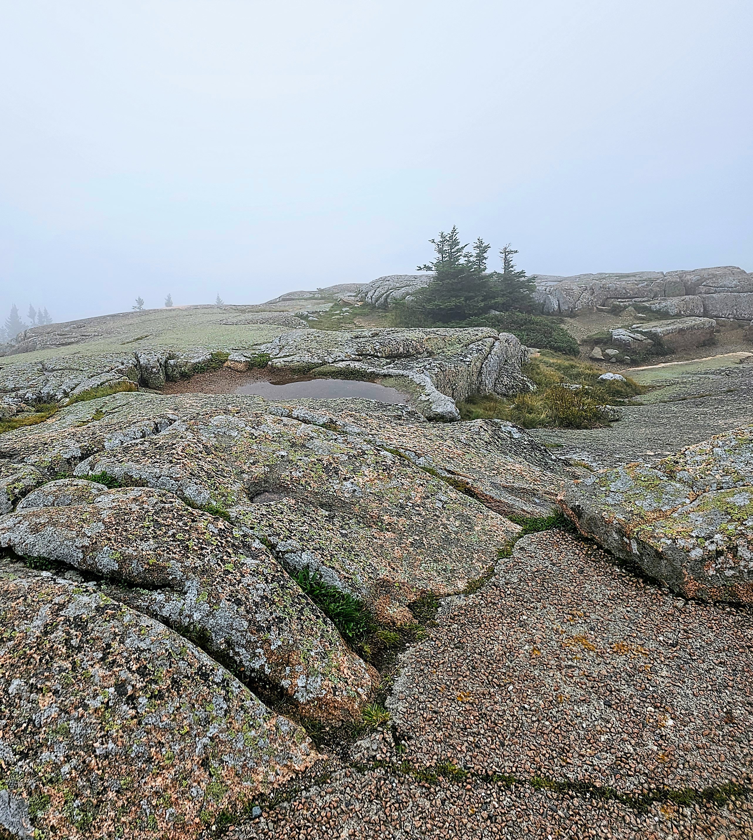Day Two – We had purchased a $6 pass for our timed entry to drive up to the summit of Cadillac Mountain, one of the most well-known sights in Acadia. Standing at 1530 feet tall, Cadillac Mountain is the highest point along the North Atlantic Seaboard and is the first place to view sunrise in the U.S. One may choose to do the 7.7 mile challenging hike to the summit or drive the 3.5 mile road like we did. On this particular day after the rain had moved out, the view from the summit was cloudy and foggy with limited visibility. Honestly, it was quite beautiful and made the landscape appear ethereal. We didn’t get the famous panoramic views we had expected. Instead, we strolled the misty trails and enjoyed the sparse crowds, ample parking, and total peace and quiet.