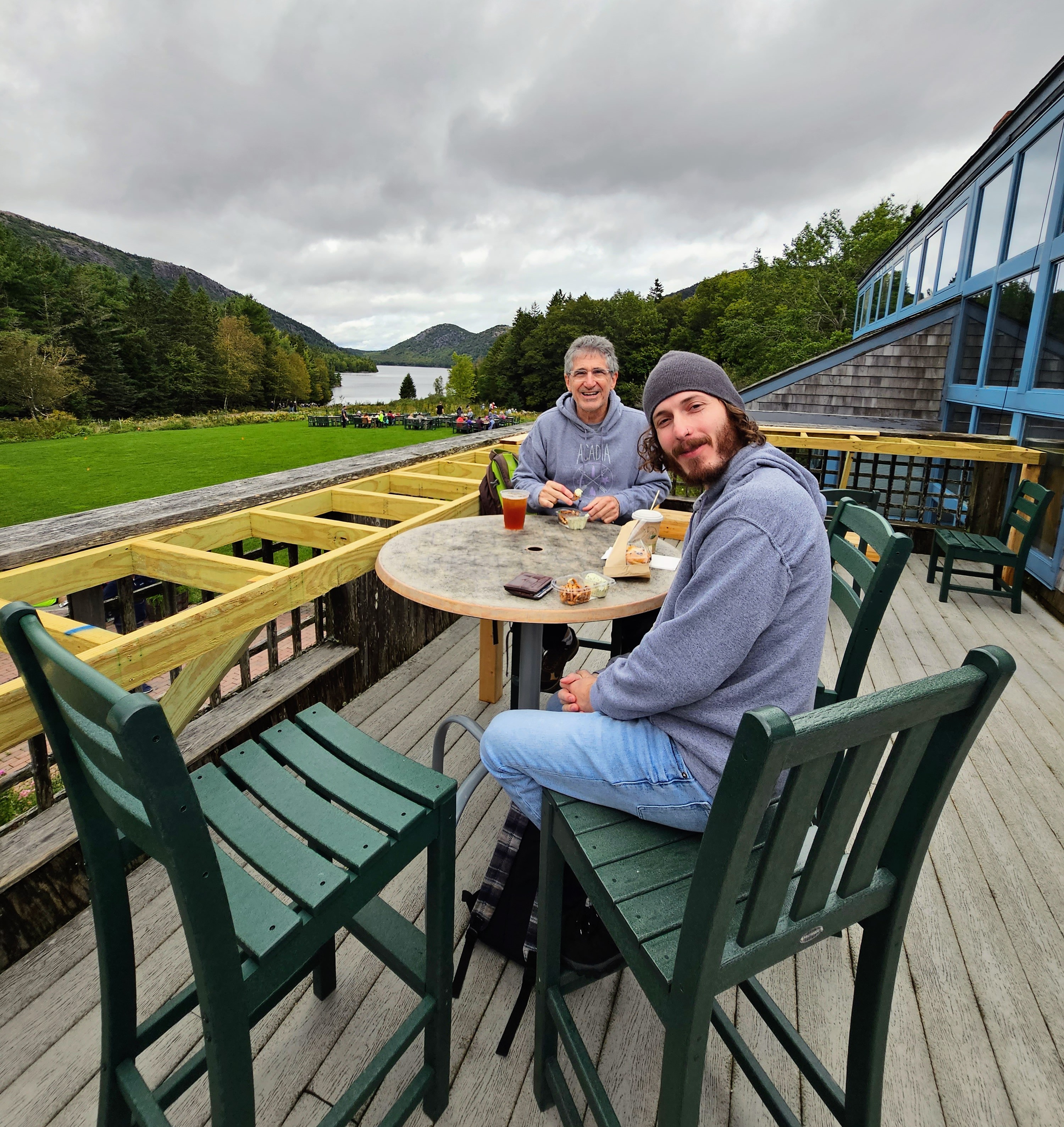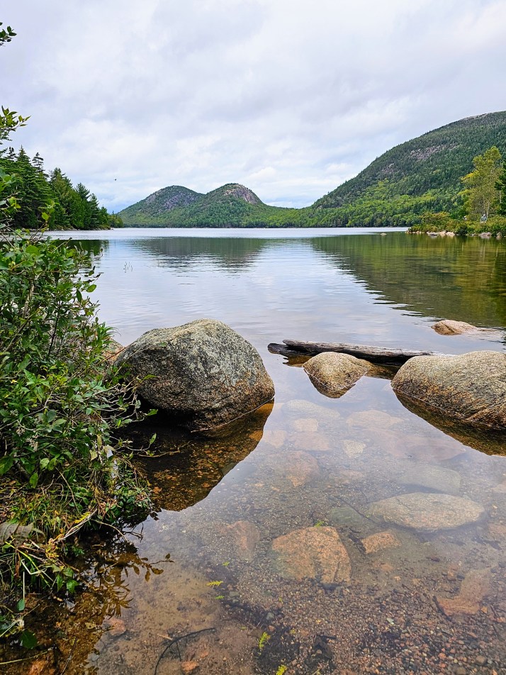 As we drove down from Cadillac Mountain, the weather began to clear at the lower altitude. Our next stop was just a few miles away, the Jordan Pond House. Parking was tough here due to the popularity, but our patience paid off. I had not been able to get dining reservations at the famous Jordan Pond House Restaurant (I tried!) since they book months in advance, but we popped into Jordan Pond’s “carry out” cafe and enjoyed snacks and drinks on an upper deck overlooking the pond. We then headed to the Jordan Pond Path, stopping off to take the iconic photo seen in every Acadia National Park ad – Jordan Pond, rocks in the foreground, North Bubble and South Bubble (twin mountains) in the background. This trail was one of my favorites. The path follows the shoreline of Jordan Pond, has little vertical gain, and is mostly a raised, two-plank boardwalk. Lush forests, ferns, shore birds, colorful mushrooms and twisty tree roots kept our interest along the entire hike. The weather was really nice by the time we completed our hike so we were ready for more adventures!