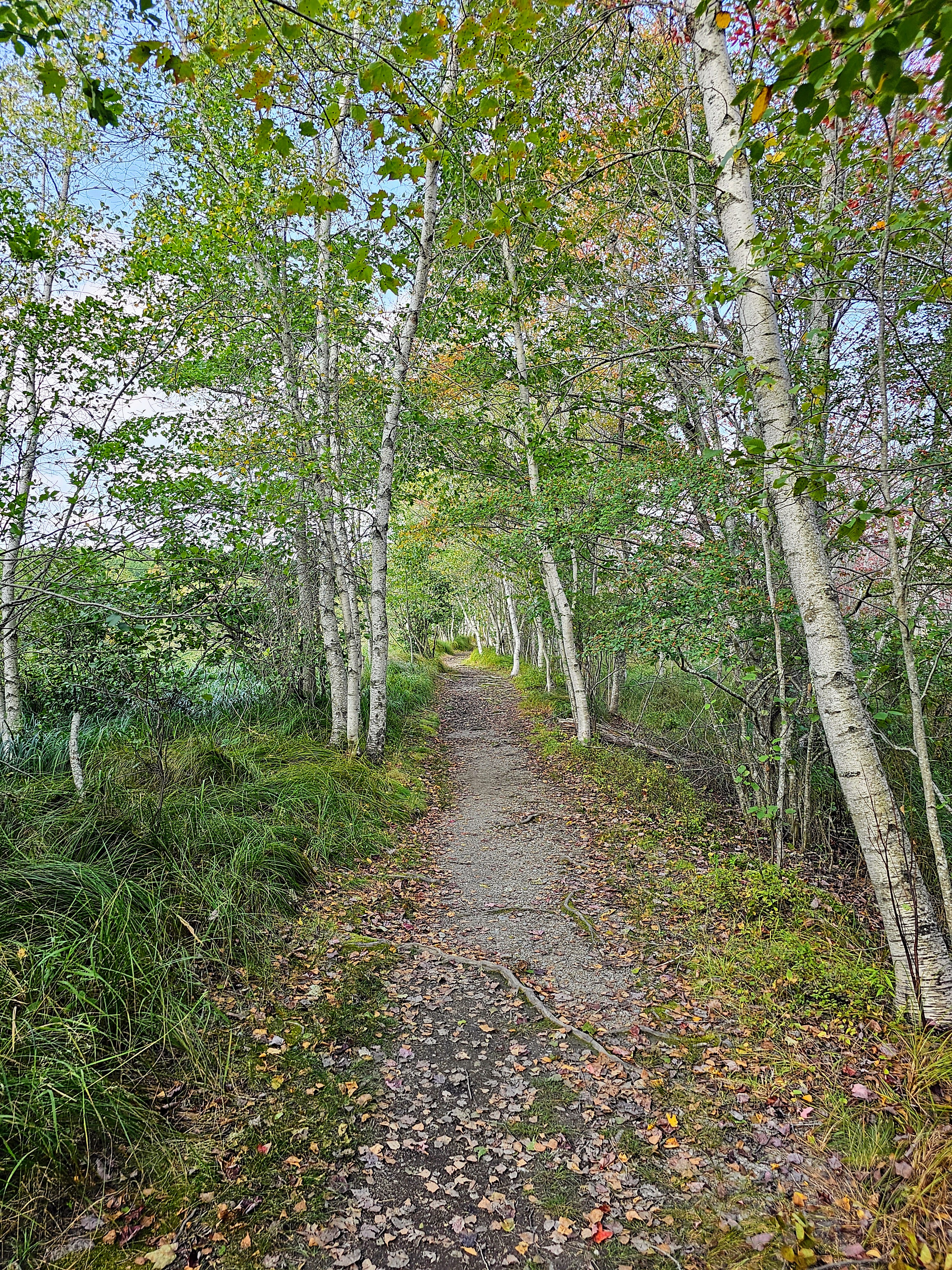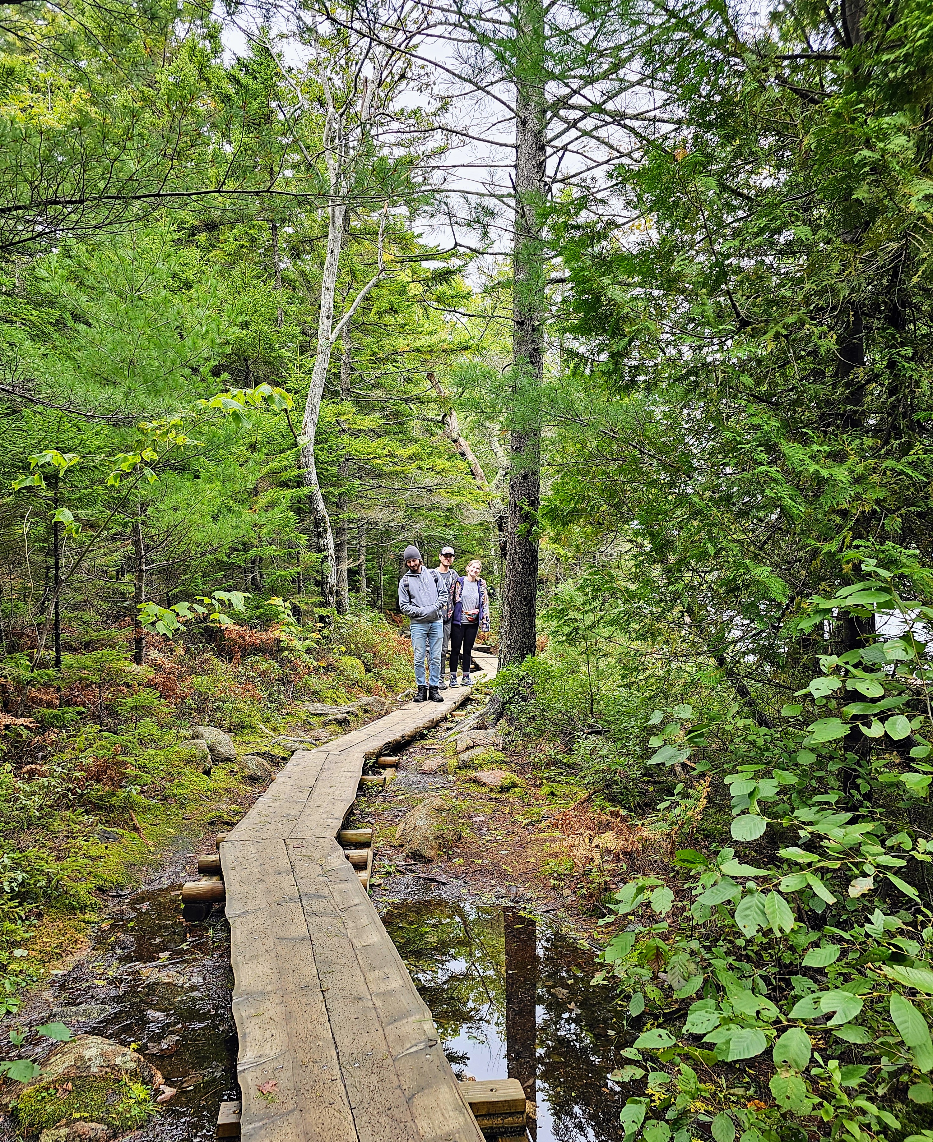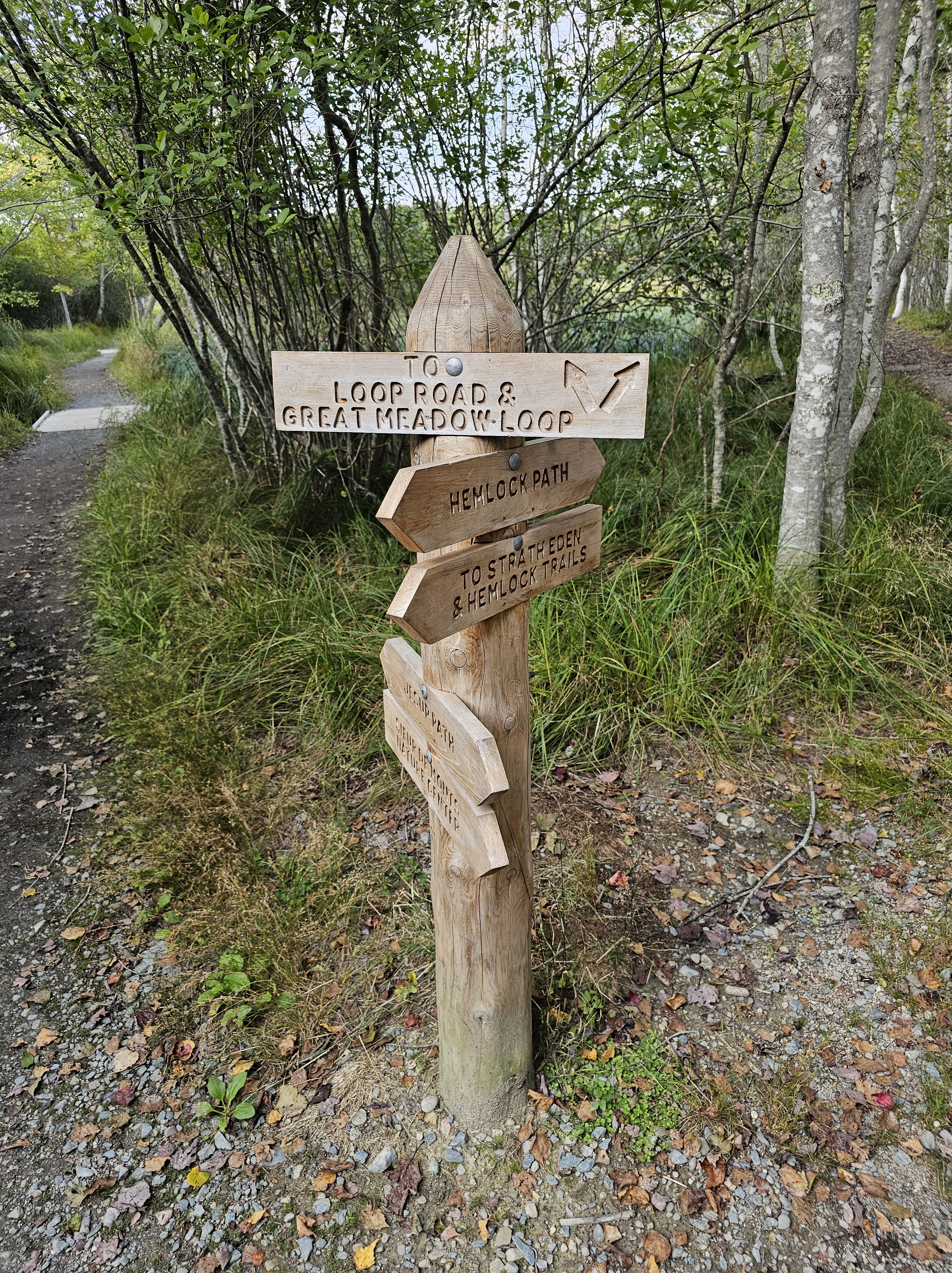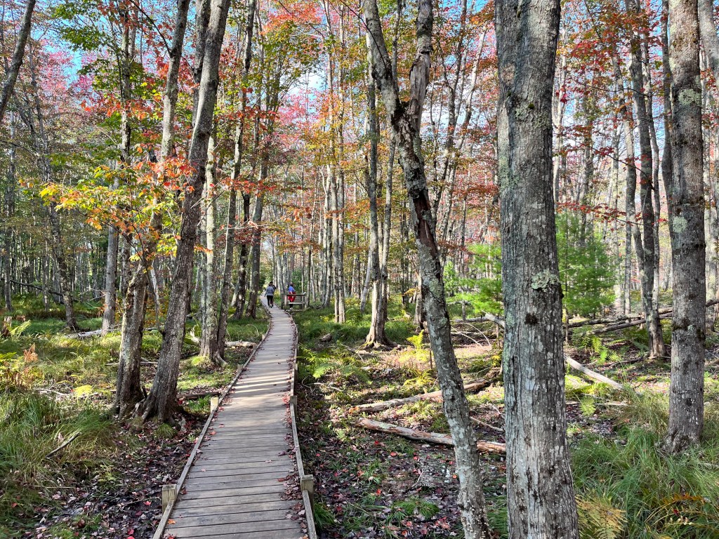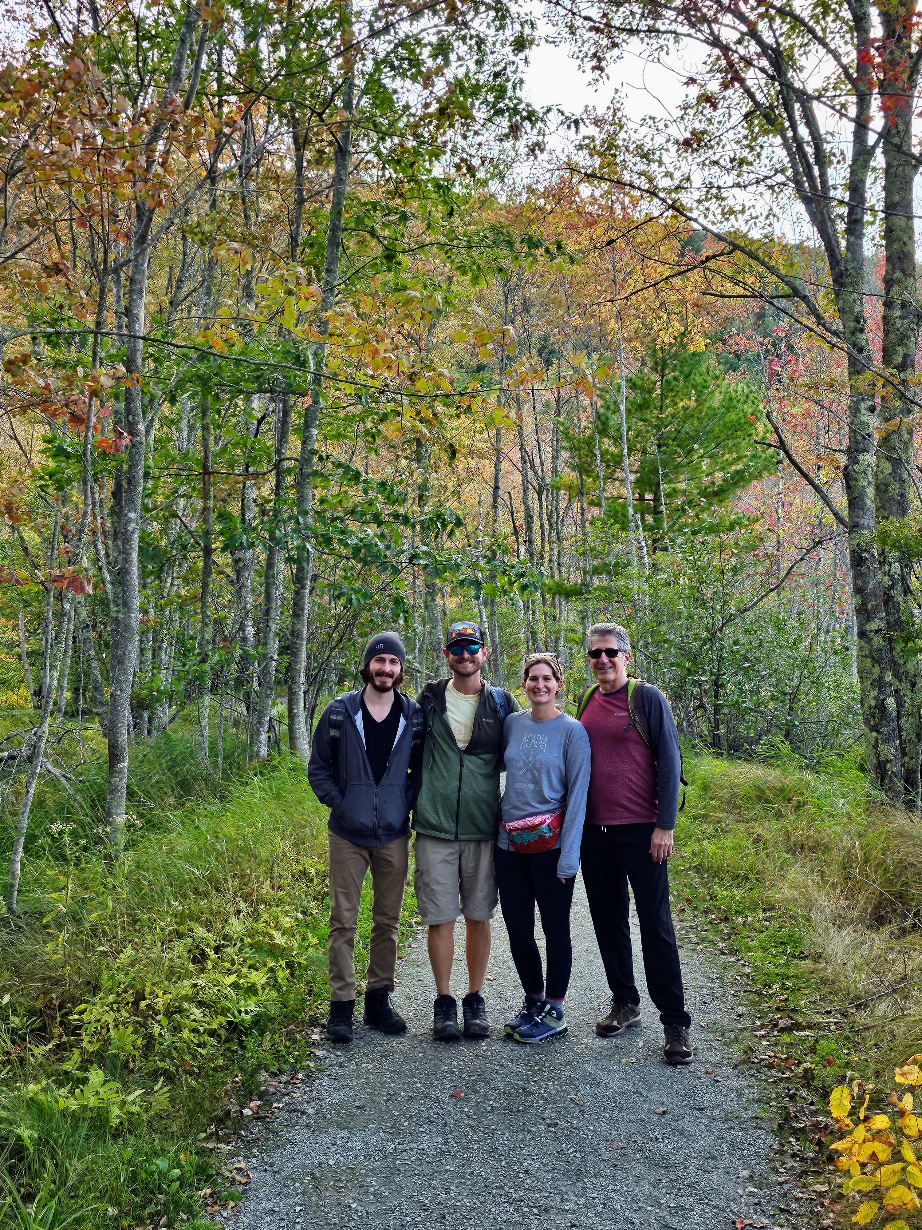 From Cadillac Mountain, we drove to Otter Cliffs along the Park Loop Road and continued where we left off the first day, due to inclement weather. This area has a very dramatic landscape with rugged, steep cliffs and strong ocean surf. We drove the loop, stopped at a little hidden cobblestone beach, then headed to the “meadow” area of the park. We met our kids (after they had completed another treacherous hike that the old people couldn’t/wouldn’t do!) and began our hike on the Jesup Path and looped back on the Hemlock Path. The meadows, wildflowers and trees along these paths made for quite a scenic hike. It was very peaceful and we only saw one other couple on these trails. Loved it! The Jesup Path was mostly a wide, wooden trail (above ground level) through beautiful trees and marshy areas. Many of the tree leaves were beginning to turn their bright fall colors of red, orange and yellow. We intersected with the Hemlock Path after a while, which was more of a forested trail with large trees, boulders and small waterfalls. This was a leisurely afternoon stroll and the perfect way to wrap up a four-day trip in Acadia.