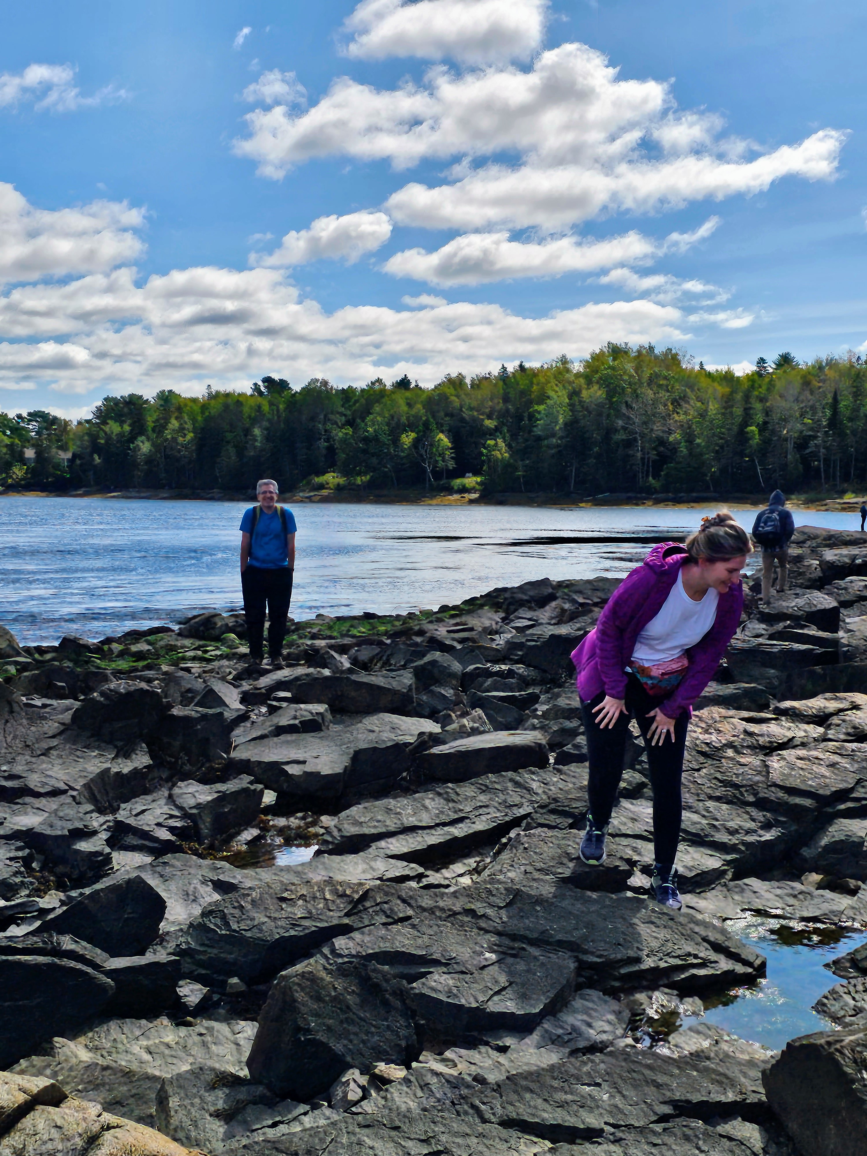 After a wonderful dockside lunch in Northeast Harbor, we headed back to Southwest Harbor. The kids went off on one of the more difficult hikes in our area and my husband and I drove to the Ship Harbor Trail. This was a lovely forested trail that treks to the rocky coast. The 2-mile trail tested my ability (3 months post-knee replacement) with rock scrambling, tree root scrambling, jumping over rocky crevices, traversing deep mud puddles and avoiding slippery granite boulders. Luckily, I lived to tell the tale! We finished the hike and met up with the young ones at Seawall, which was nearby. We did some rock and shell hunting on the shore and headed back to the rental, What a wonderful day it had been. I had hiked almost 7 miles with my new titanium knee! It was an exhausting day – but well-worth the experience.