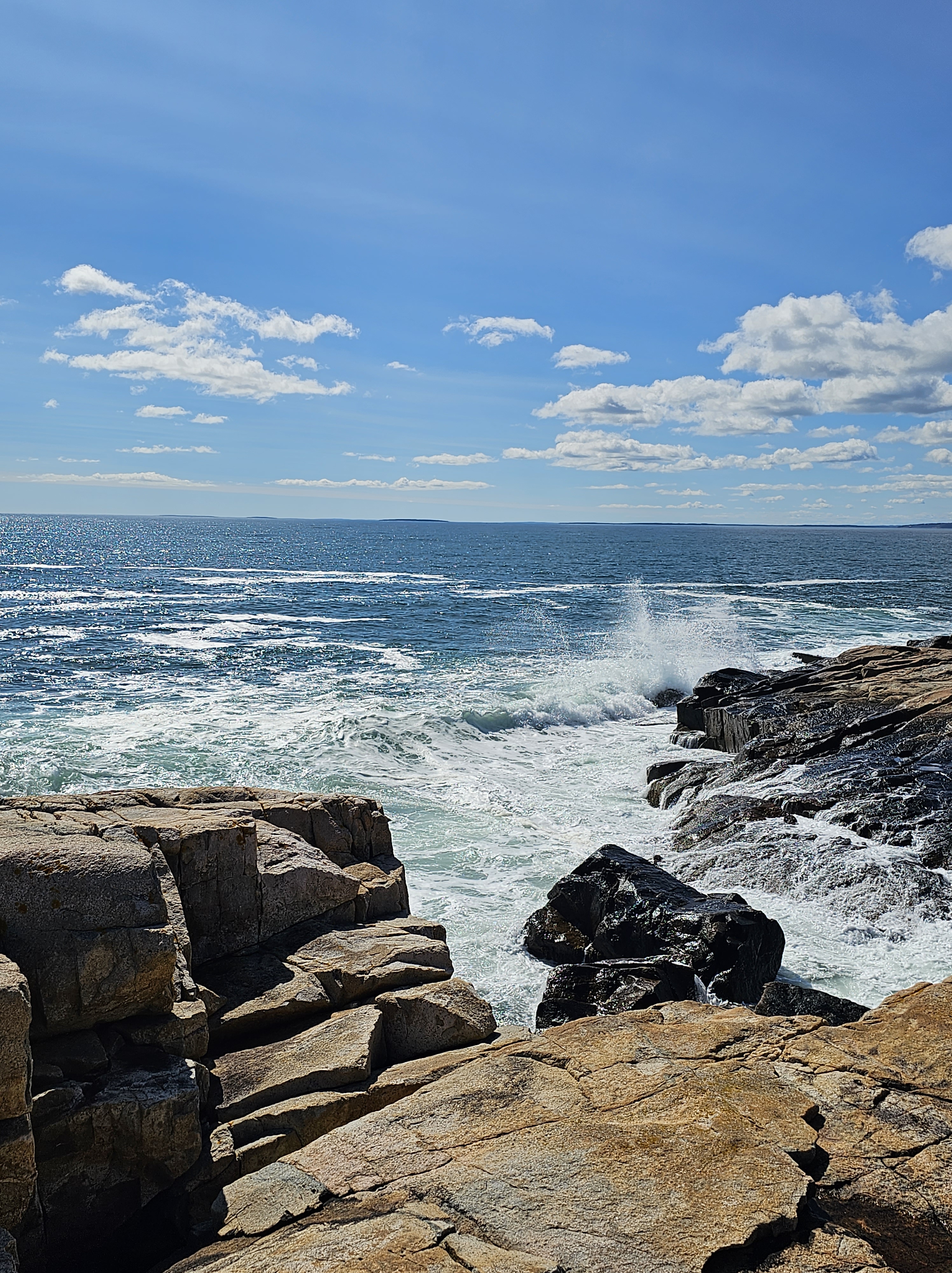 Day One – We began our day at Hulls Cove Visitor Center to grab park maps, check for any closures or storm issues, and buy T-shirts. From there, we began our drive on the Park Loop Road, a 27-mile scenic loop around the park. Most of the must-see attractions are along this loop and I highly recommend exploring by car, bicycle or on the park’s shuttle bus the first day in the park. We stopped at Schooner Head Overlook for a photo op for nice views of the ocean. Sand Beach was our next stop and was definitely a favorite. Sand Beach is a very scenic, narrow stretch of sandy beach surrounded by cliffs and tucked between two headlands. This beach is very popular for good reasons. It was absolutely beautiful! Continuing down Park Loop Road, we stopped at Thunder Hole. This is a “hole” in the granite rock shoreline where ocean waves come crashing in with a thunderous boom! There is also a paved trail, the Ocean Path, where you can stroll along the coastline from Sand Beach to Thunder Hole and on to Otter Cliff if you would rather walk than drive.