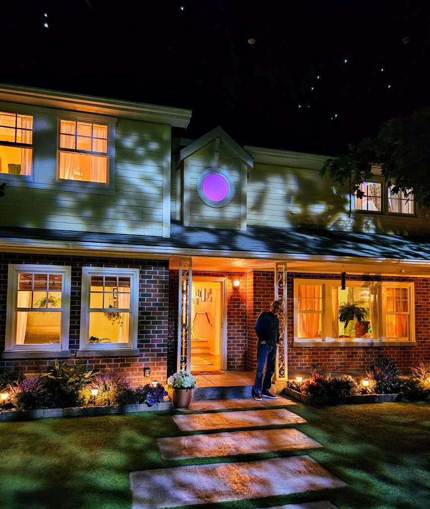 You enter the “immersive experience” through heavy doors and step right into a pleasant night scene. A nice, suburban, two-story house stands in front of you. The sky is lit with stars. Lights shine through the curtains in the home – someone is home, or are they? A vegetable garden is on your left. A gardening shed and a garage is on your right. The porch light is on. Let’s head inside!