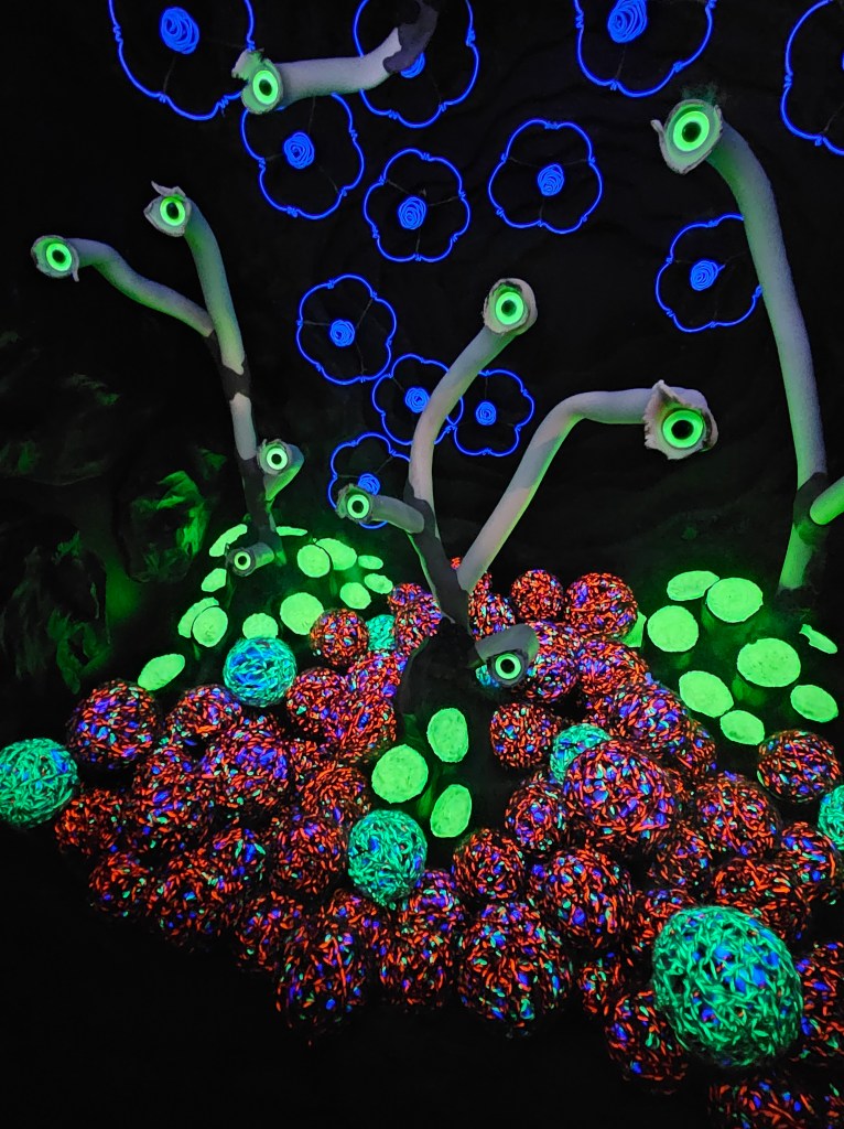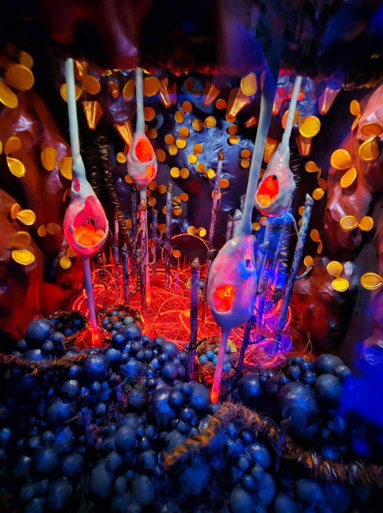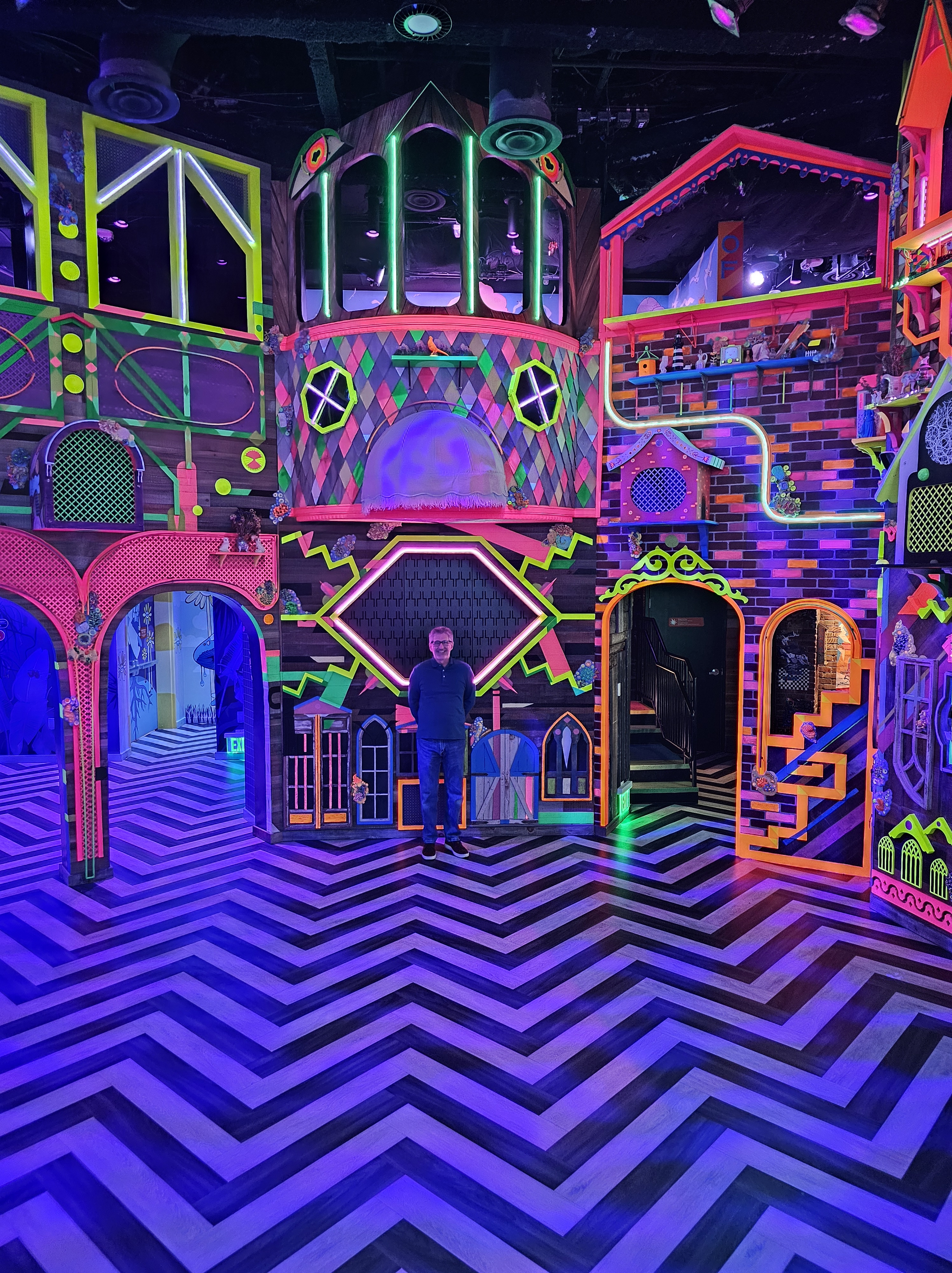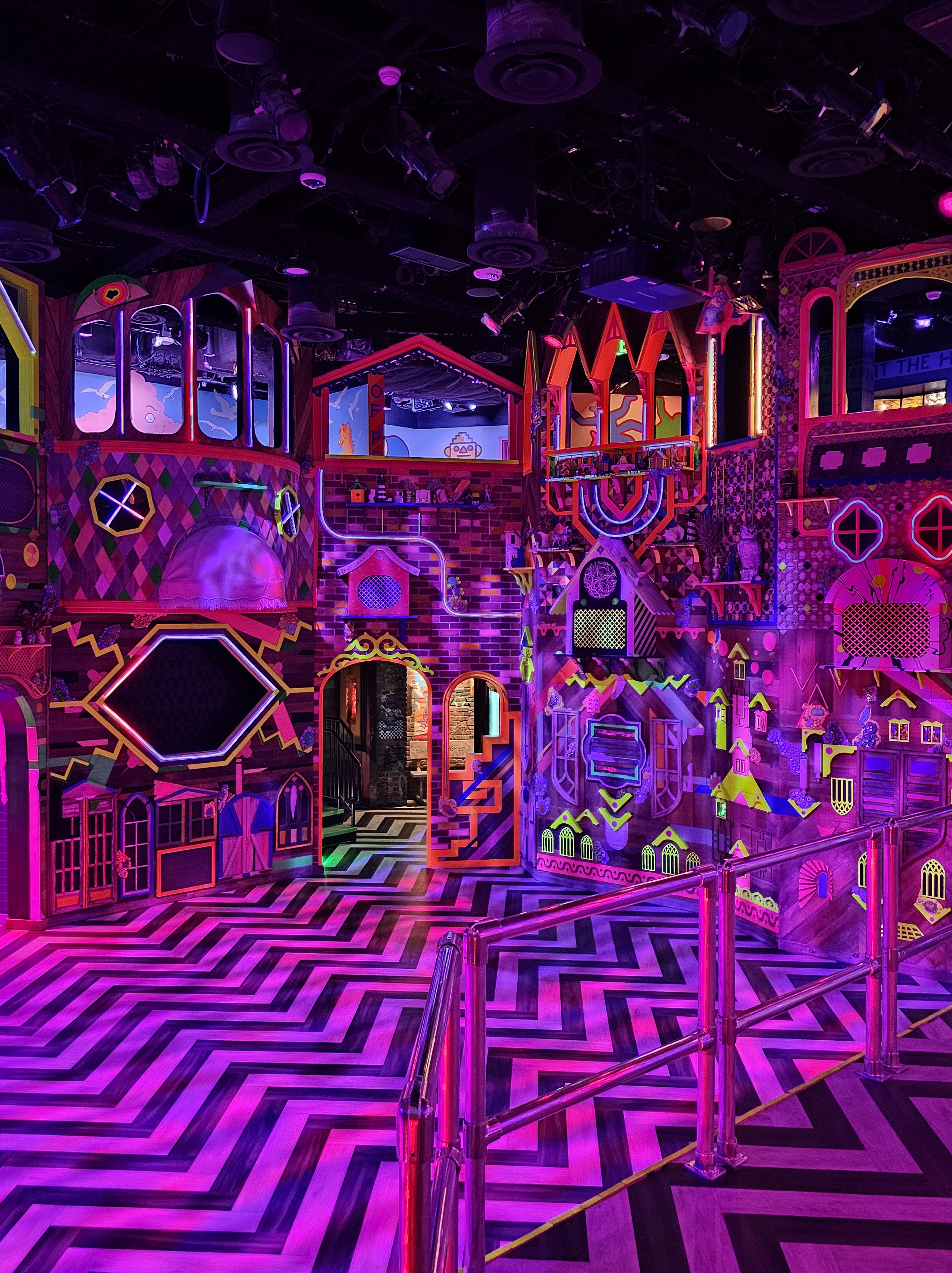 Every hallway leads to the unexpected. Doors lead to somewhere or nowhere. Touch certain things and they light up, play musical notes or both. Walk through the stars. Climb stairs to a different dimension. Look up and see what is suspended overhead. Get lost in a maze of rooms. Press that button. Been here before? Find a different “pathway” to another area. Are you still with me??