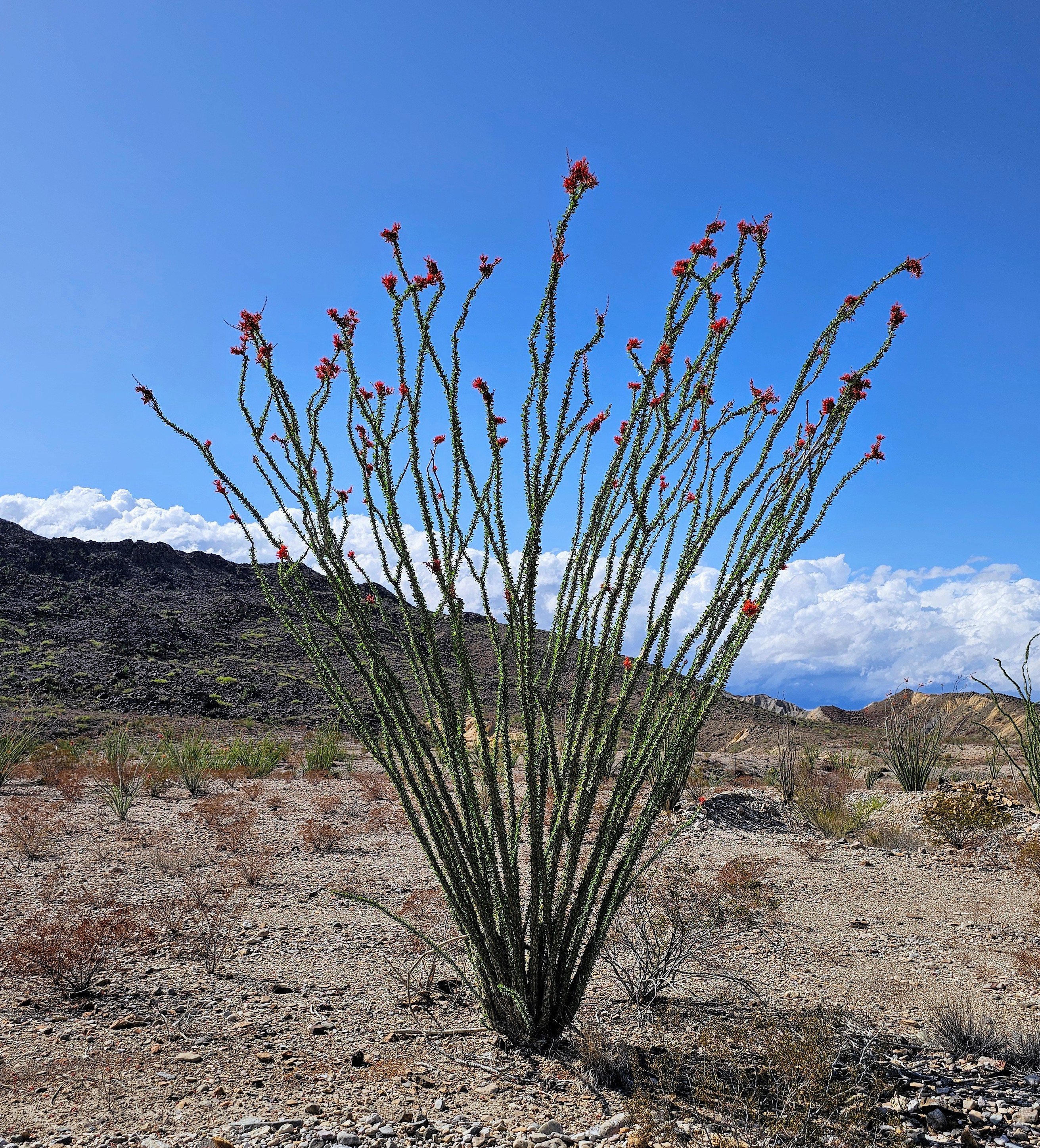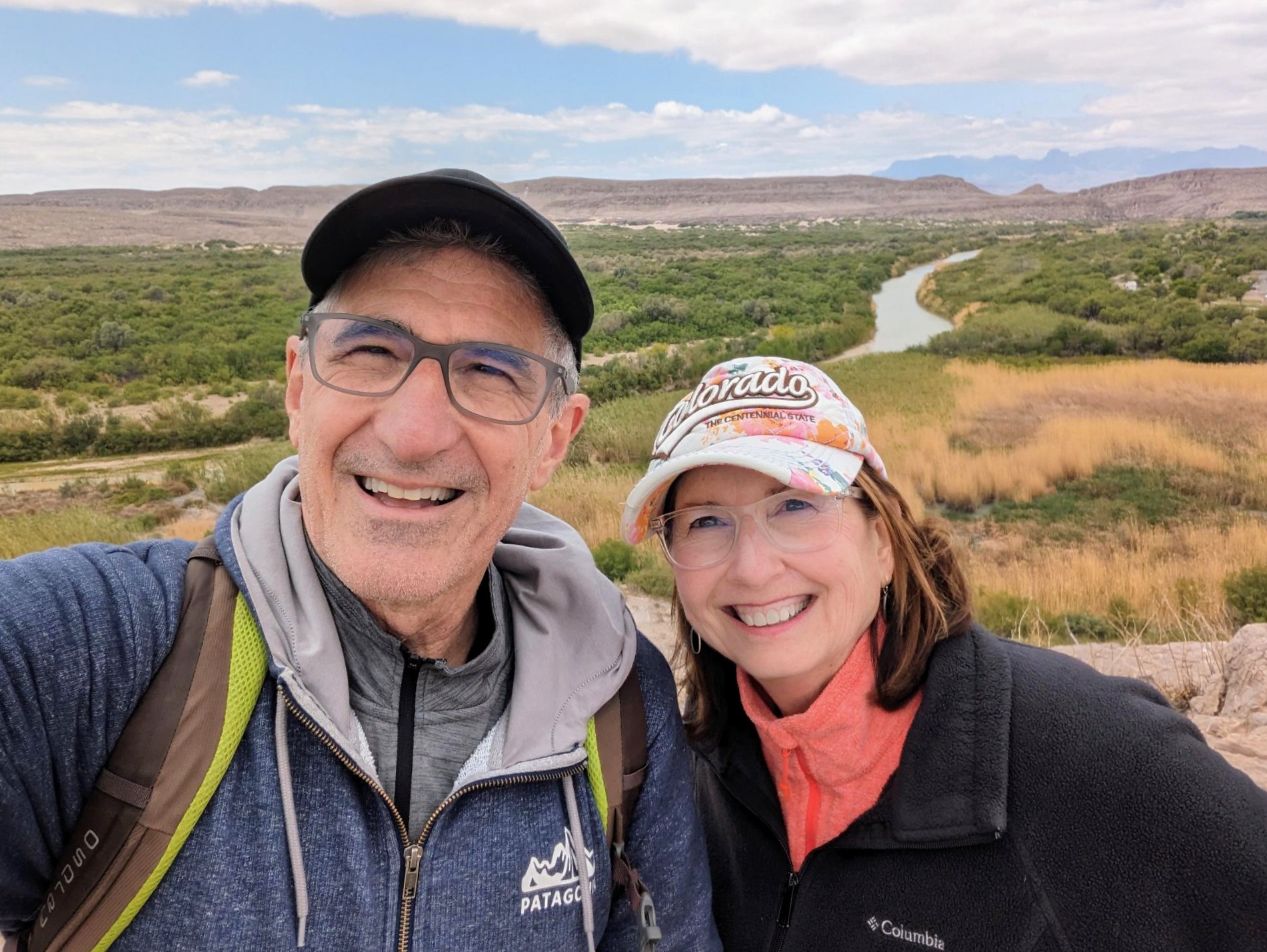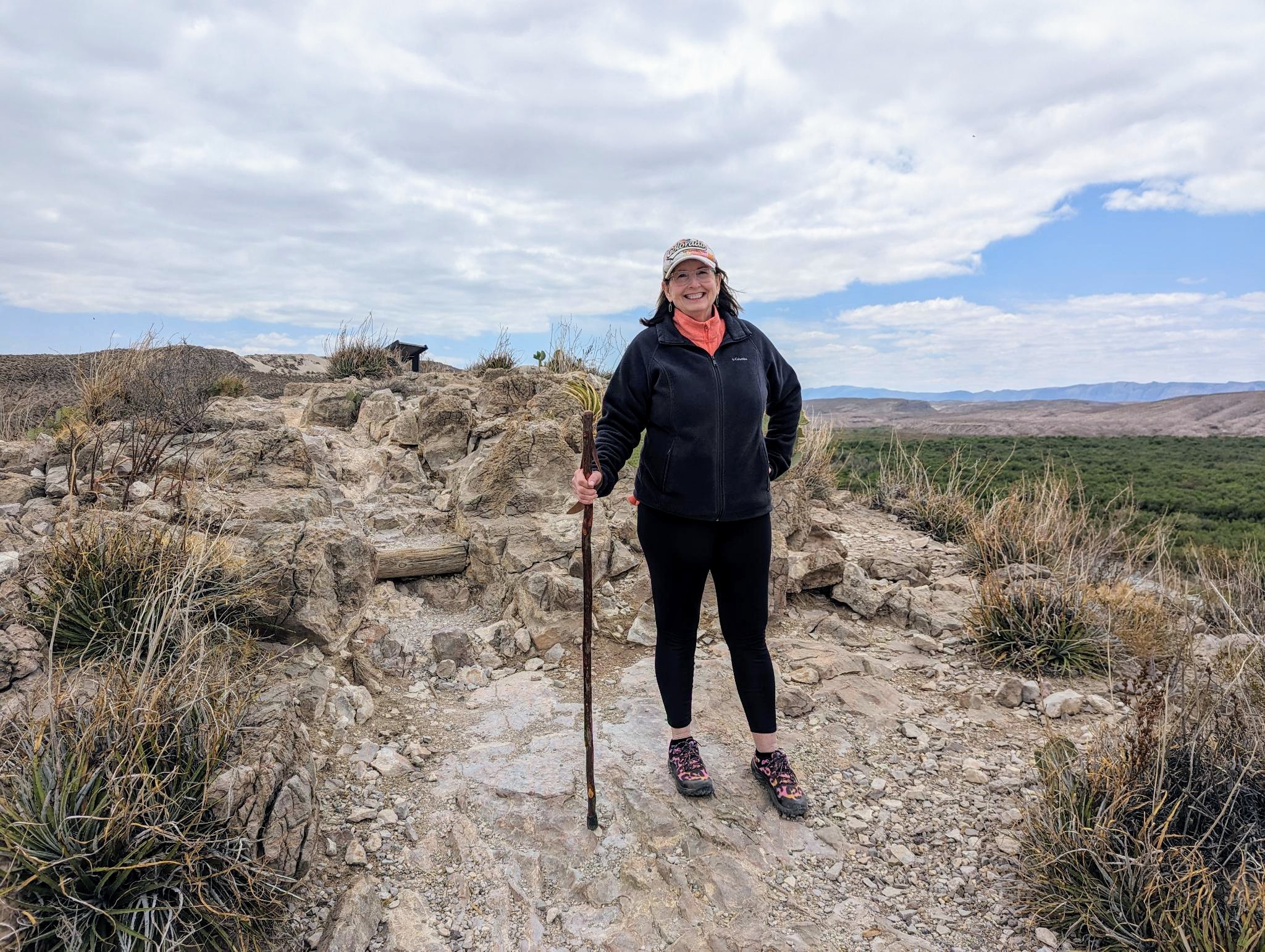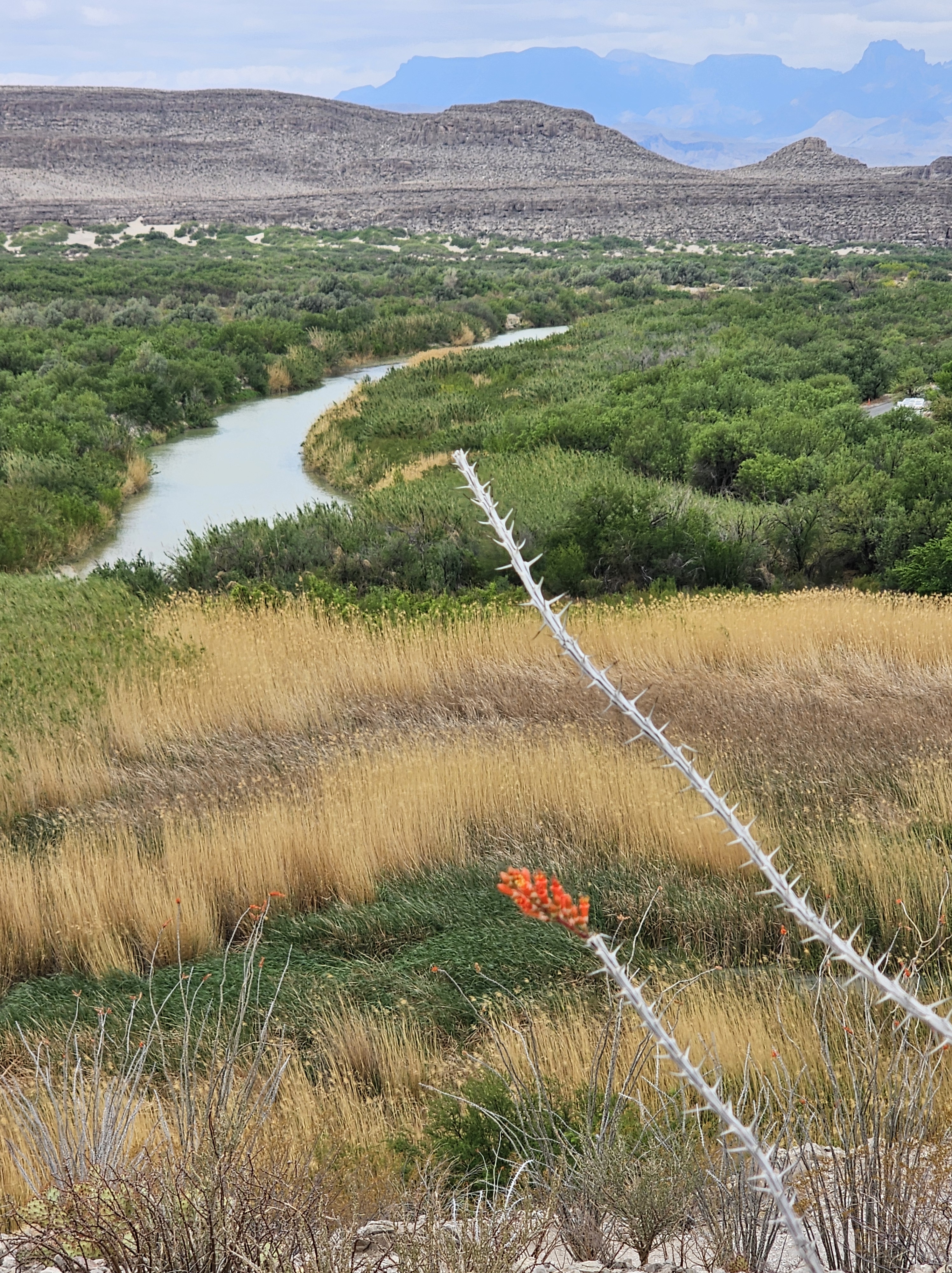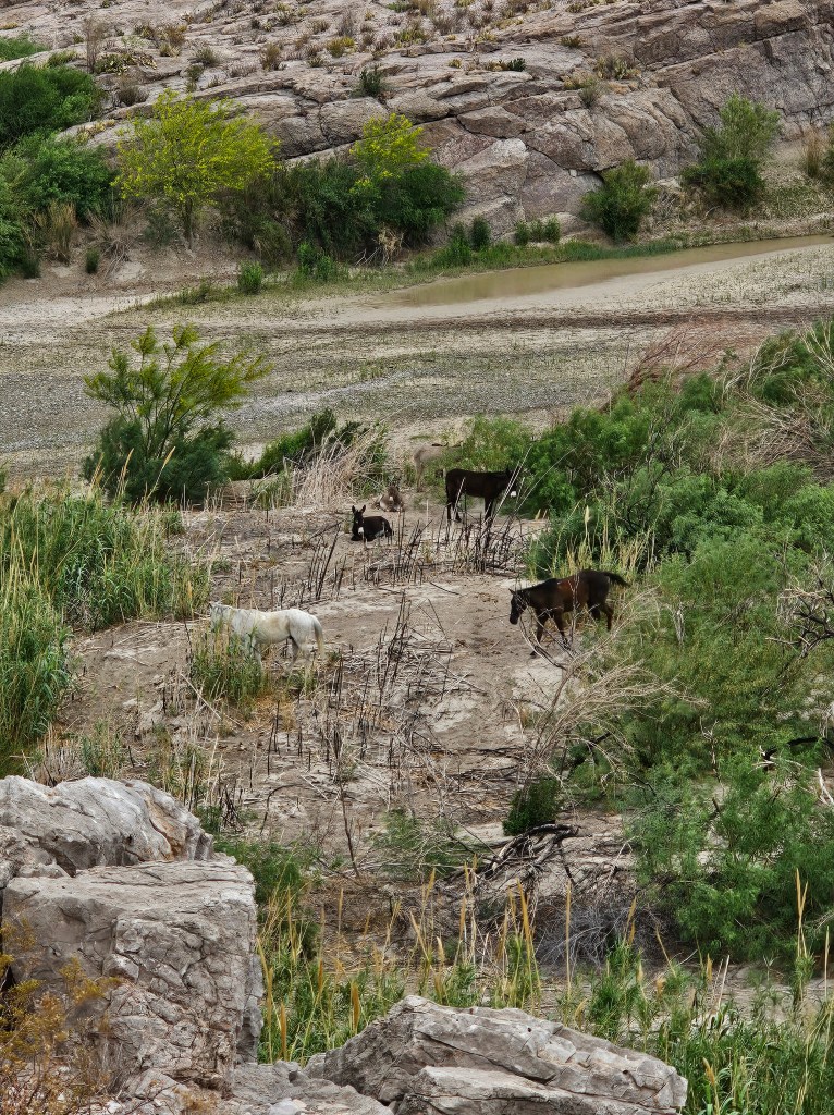 Back to the hiking – we followed this trail up onto a high lookout point and enjoyed the view below. As we stood on the rocky precipice, we could see all the colors of the Chihuahua Desert. There were green marshy areas and cacti, white sandy river banks, yellow/brown water, blue skies, grey burros, black and white horses, and brown rocky terrain. There were also red ocotillo blooms and my red face from the exertion of the uphill climb! Going back down was much easier, thankfully.