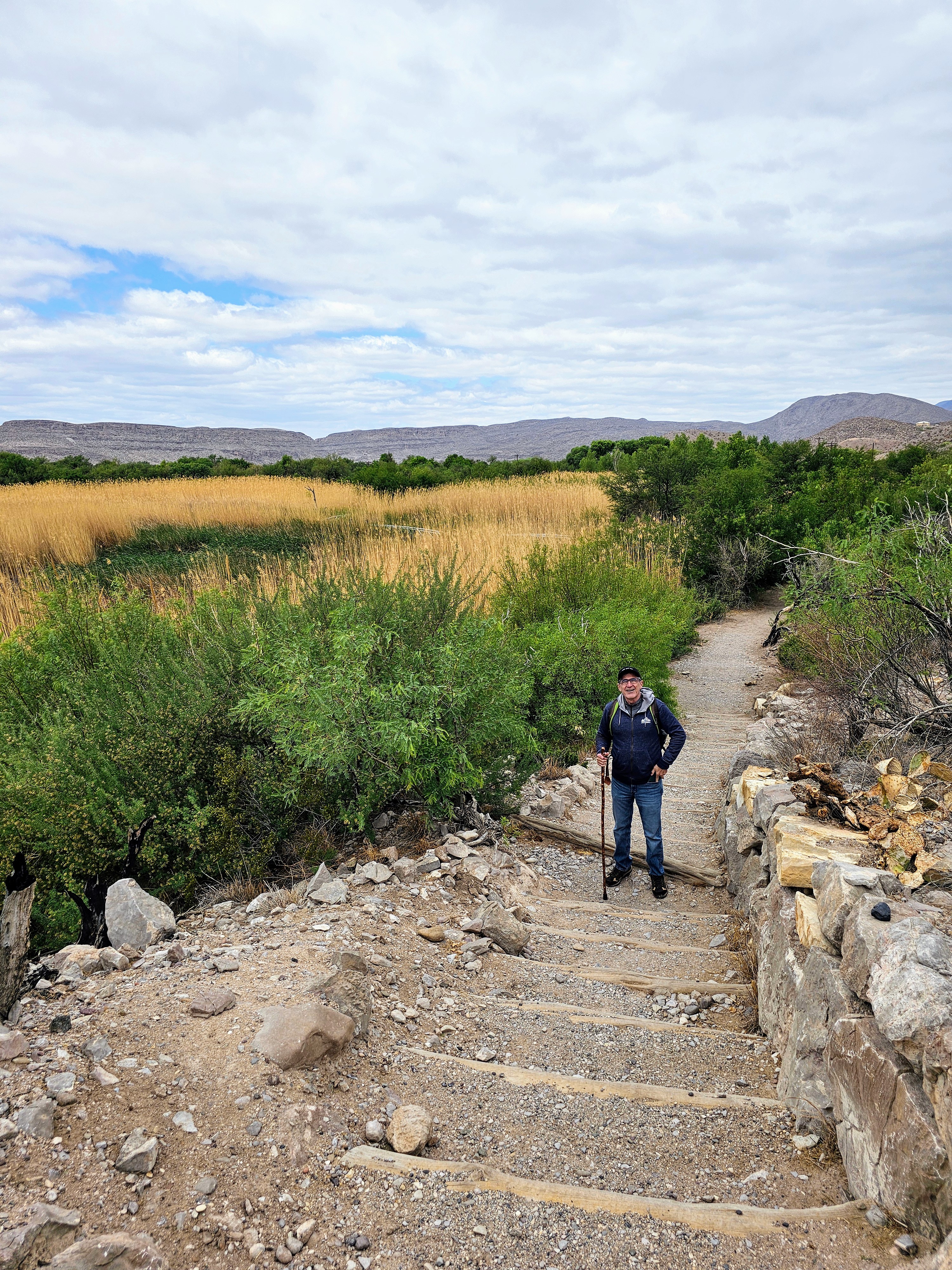 After reaching Rio Grande Village Visitor Center, we got directions to the Rio Grande Village Nature Trail trailhead and began our first trek from a campground parking lot. The trail began in a cool, marshy area but quickly changed to a sandy, rocky trail leading toward the Rio Grande River.
