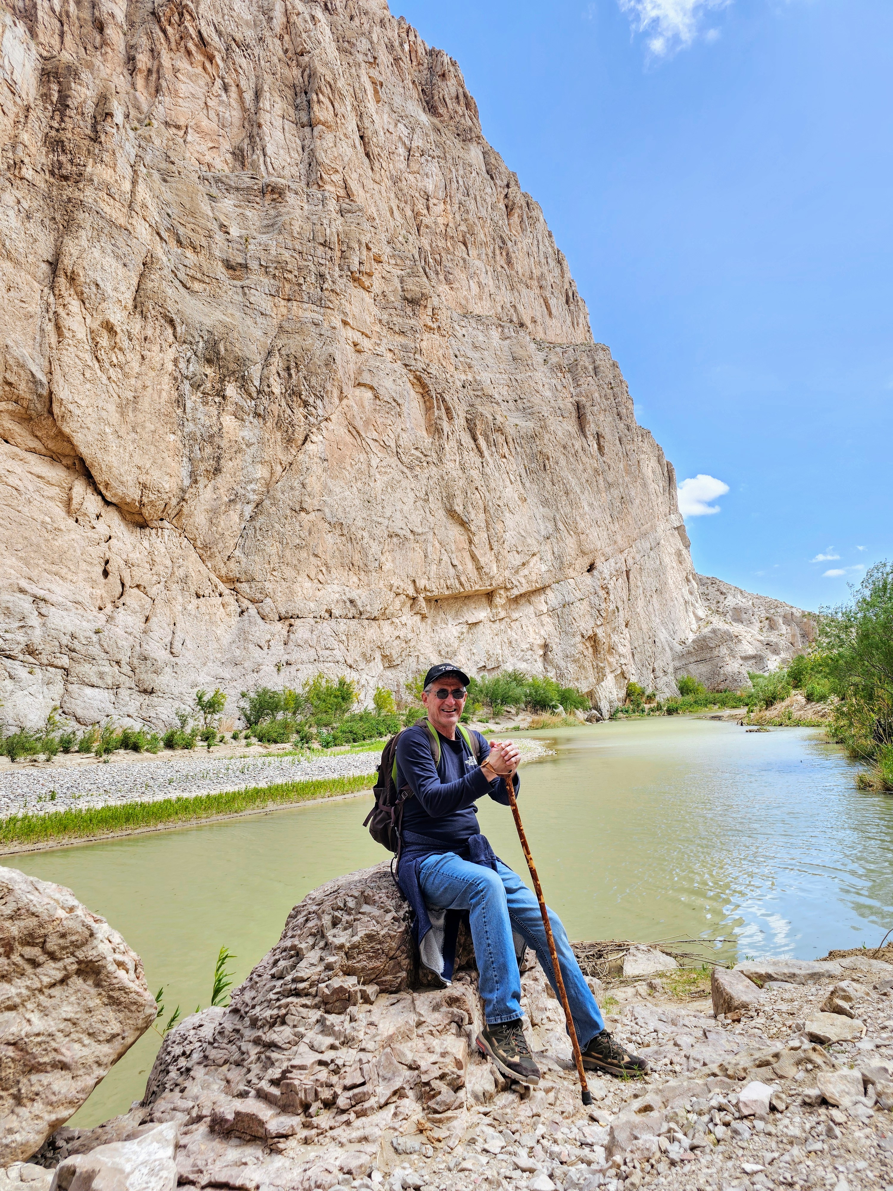 This was a two-mile round-trip trail located between sheer cliffs and towering rock walls with the sleepy Rio Grande River in between. The United States was on one side – Mexico was the on the other. The path led us through huge boulders and rocks until it ended on a sandy bank where the canyon wall met the river. What you see here is the narrowest point in the entire Santa Elena Canyon and it was a spectacular sight. It was very quiet. It was very peaceful. It was very easy to understand why this place was so popular. Gorgeous scenery!