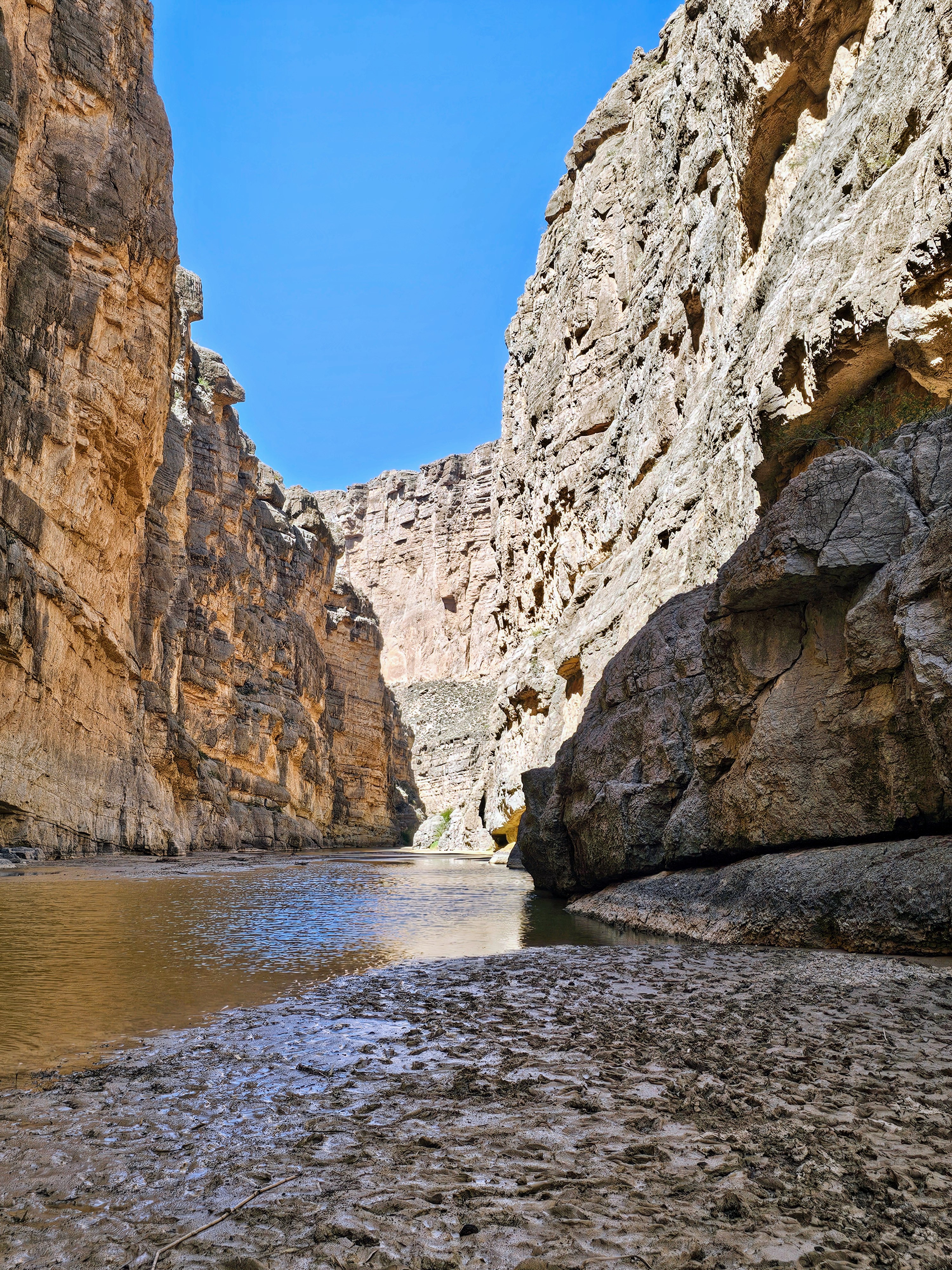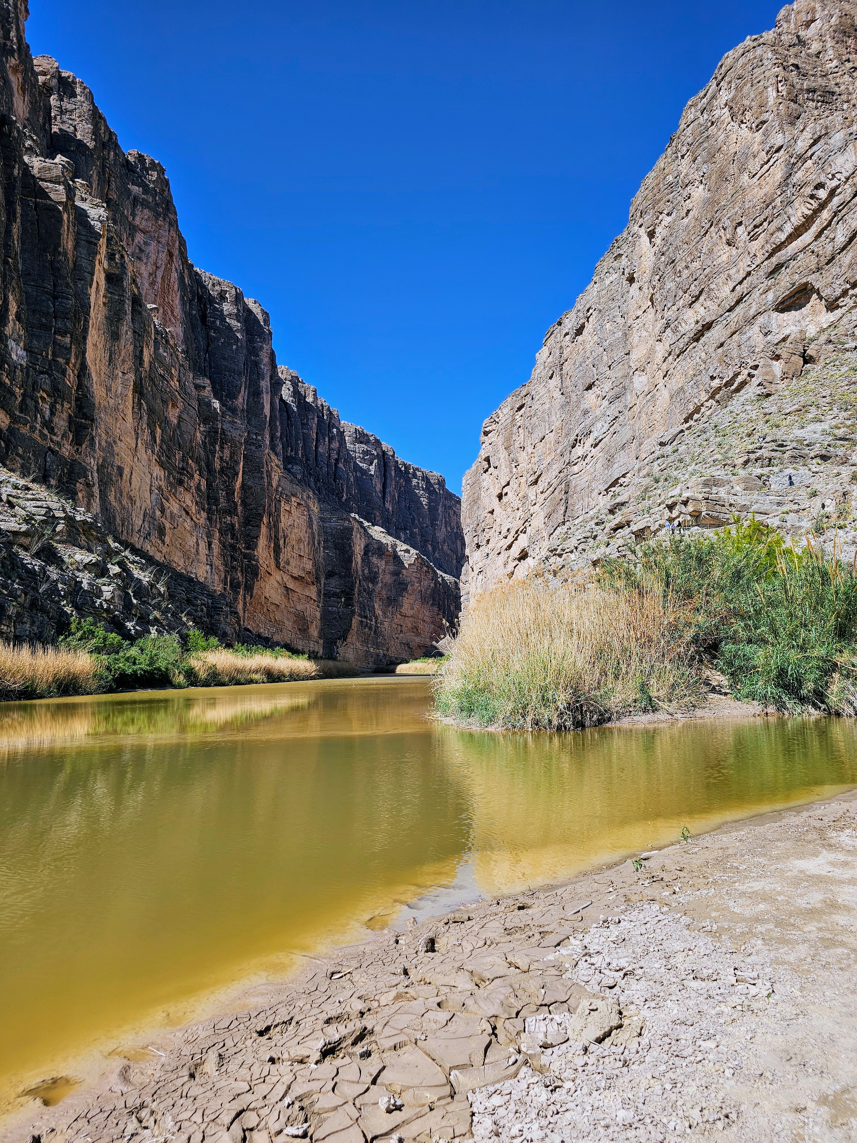 The Santa Elena Canyon Trail parking lot was fairly full and we did see more people here than all the other places in the entire park combined. The trail began from the parking lot and soon crossed Terlingua Creek. Luckily for us, it was not muddy and was more of a dry creek bed on this day. We did have to climb up a steep bank and follow a dense, winding trail to the actual start of the canyon hike.