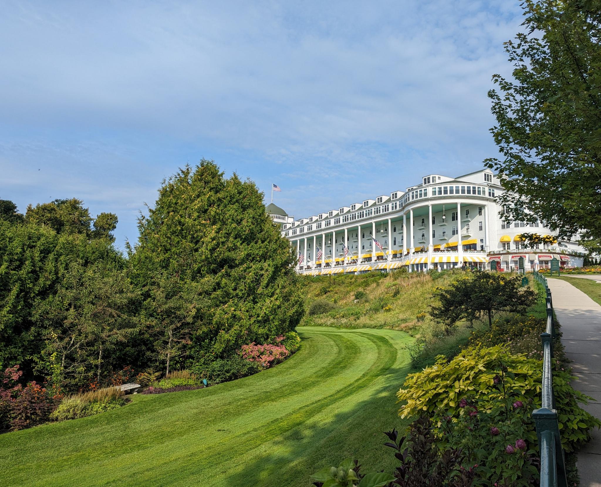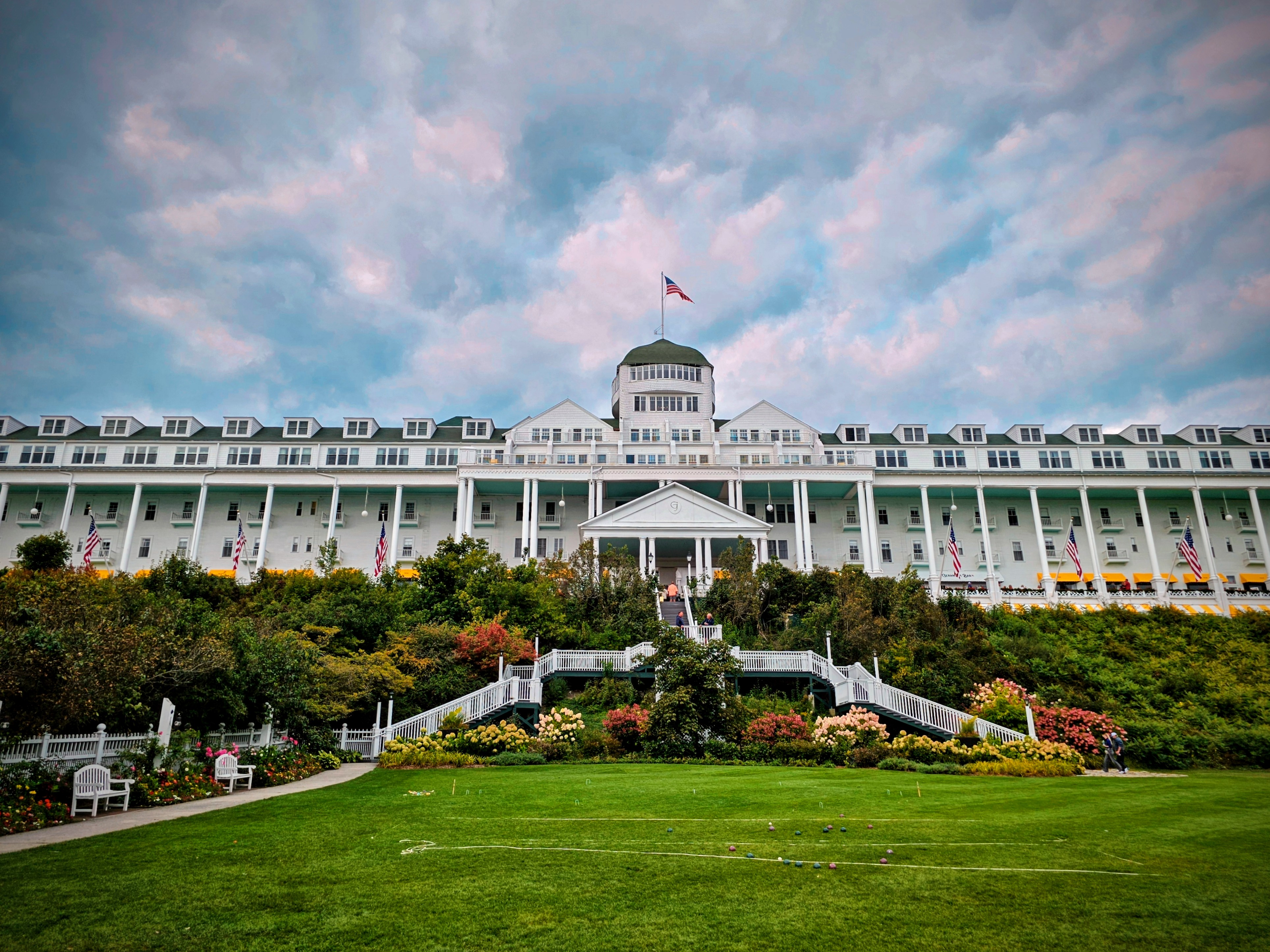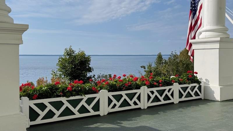 My first impression of the Grand Hotel was just how BIG it really was! Photos don’t do it justice. There are four floors, huge white columns, yellow awnings, red flowers, American flags, and a 660′ long porch. The porch extends the entire length of the building and is claimed to be “the world’s longest porch.” It was evident why this hotel received National Historic Landmark status. Wow!