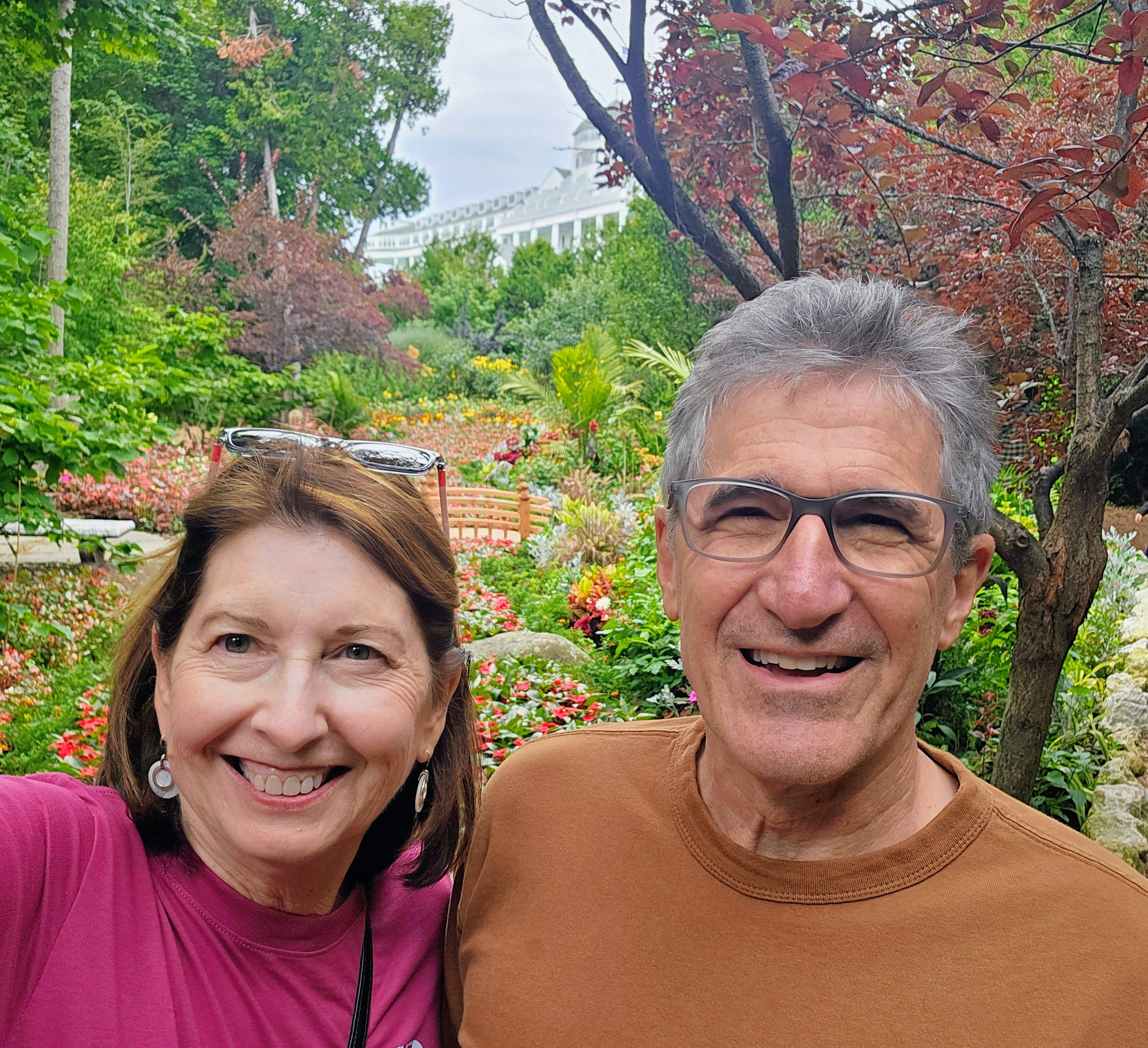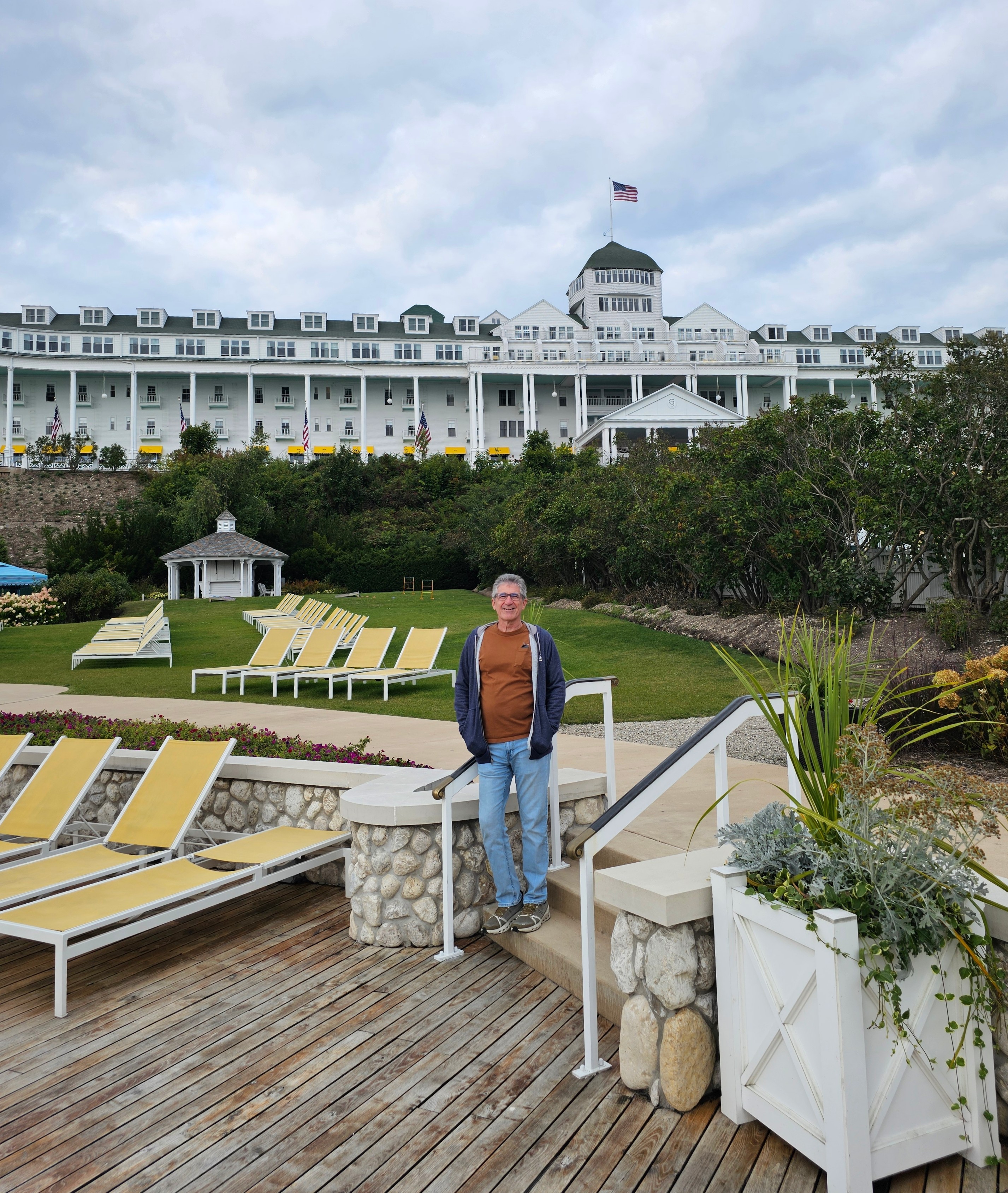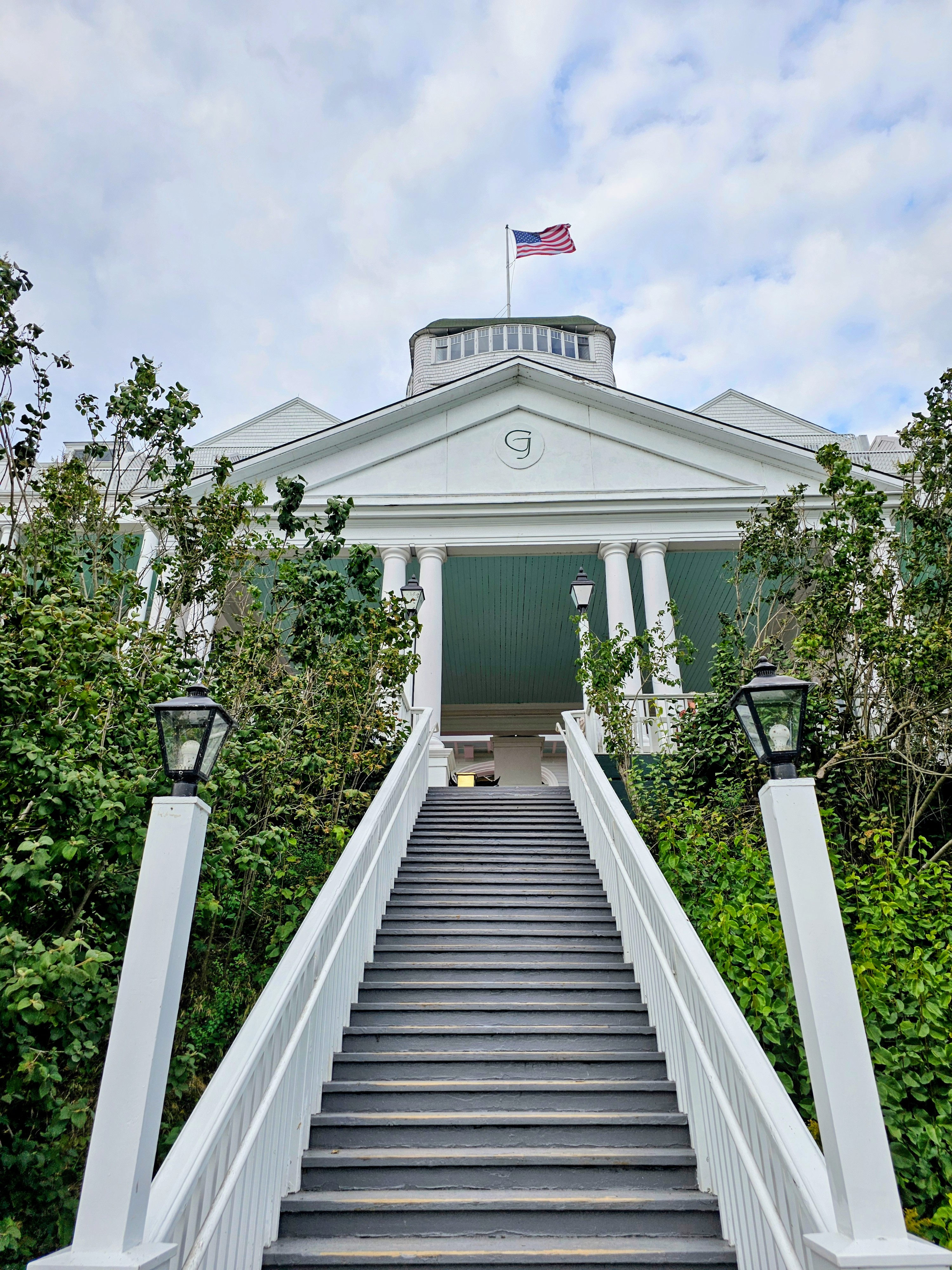 My first impression of the Grand Hotel was just how BIG it really was! Photos don’t do it justice. There are four floors, huge white columns, yellow awnings, red flowers, American flags, and a 660′ long porch. The porch extends the entire length of the building and is claimed to be “the world’s longest porch.” It was evident why this hotel received National Historic Landmark status. Wow!