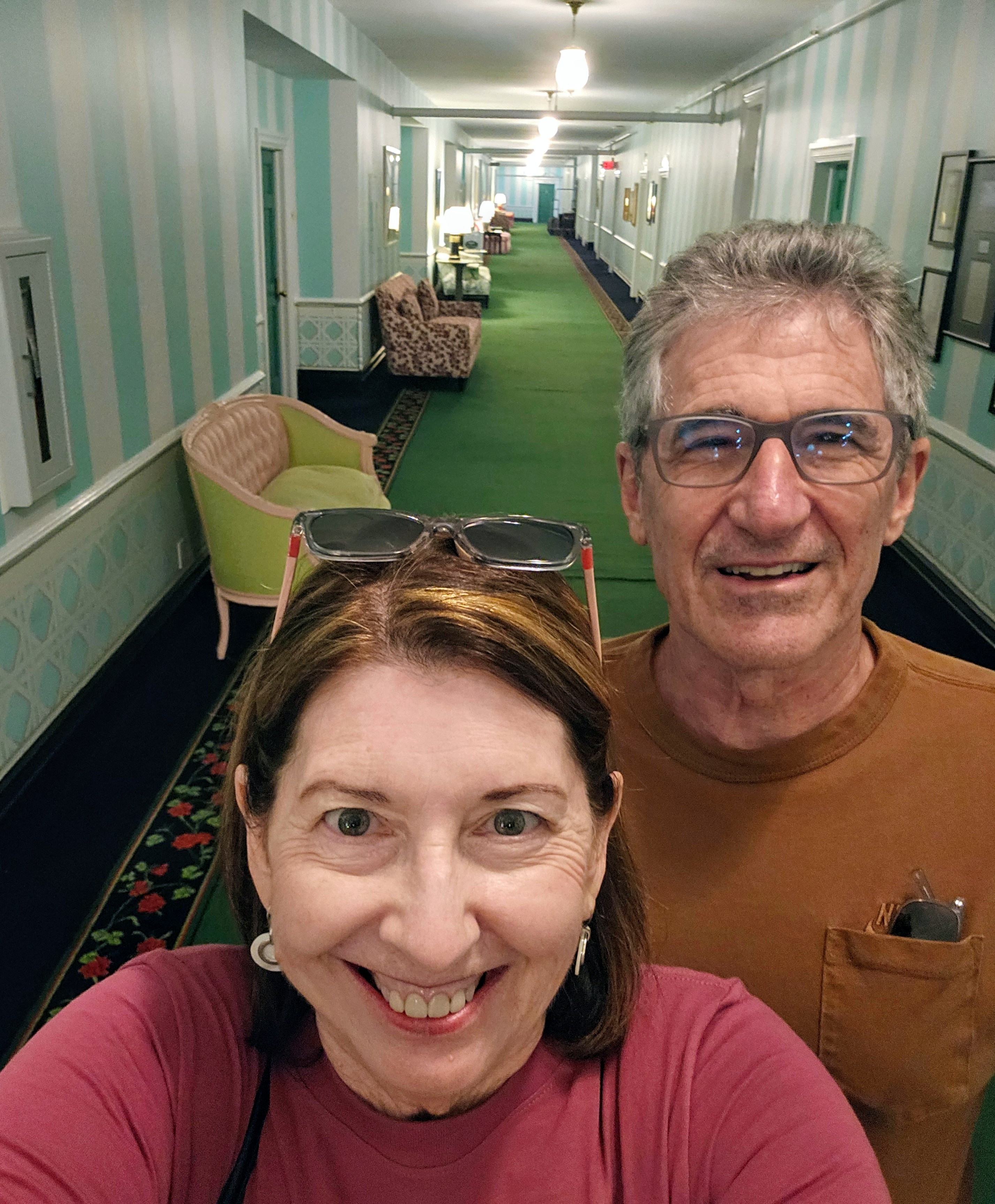 Our room was on the third floor and was quite interesting! I am a “matchy-matchy” kind of person and this room was anything but that! The color scheme was definitely green (all shades!). The wallpaper had green and purple violets. The carpet was bright green with one red step in the doorway. Our chairs were green (think Kermit the Frog) velvet. Our drapes were multi-color floral and the bed skirt was lavender polka dot! The art work had various shades of green – much, much green – but was mostly modern abstract. Think of an old, rich, great aunt’s house in the 1970s or 1980s for your vision. Our friends’ two rooms were just as bad/good?