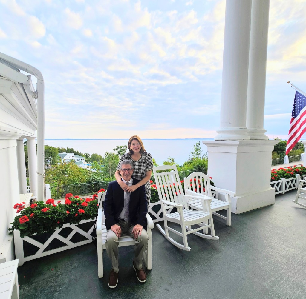 My husband and I had the opportunity to visit the Grand Hotel with two other couples. One couple was originally from Michigan and had visited there before. They proved to be great tour guides, especially with the actual “getting to” the island. We flew non-stop from Dallas to Traverse City, drove to Mackinaw City (I know! This one actually is spelled with a “w”!) and spent the night there. We got up early the next morning and took the ferry over to the island for our two-day stay at the Grand Hotel.