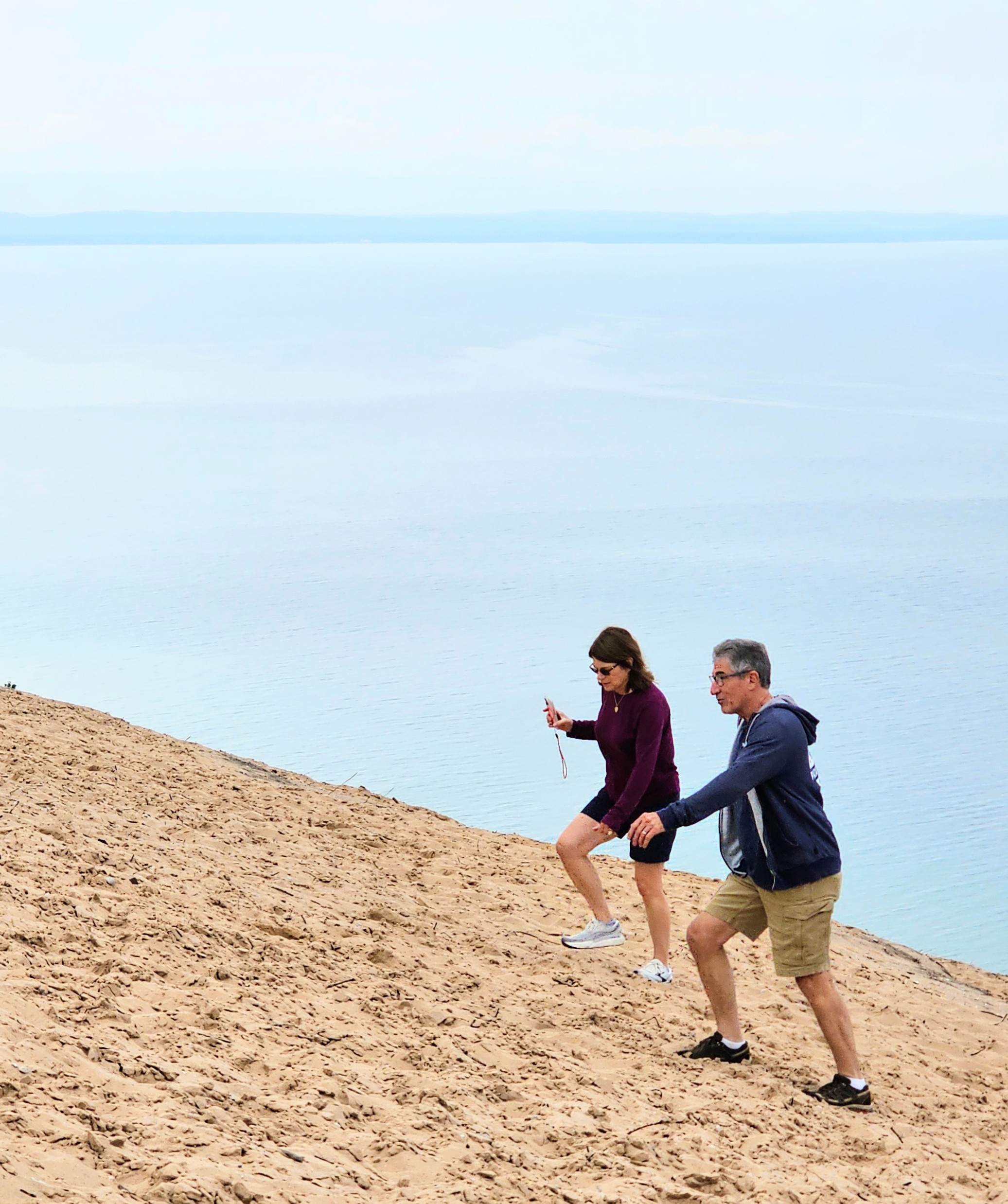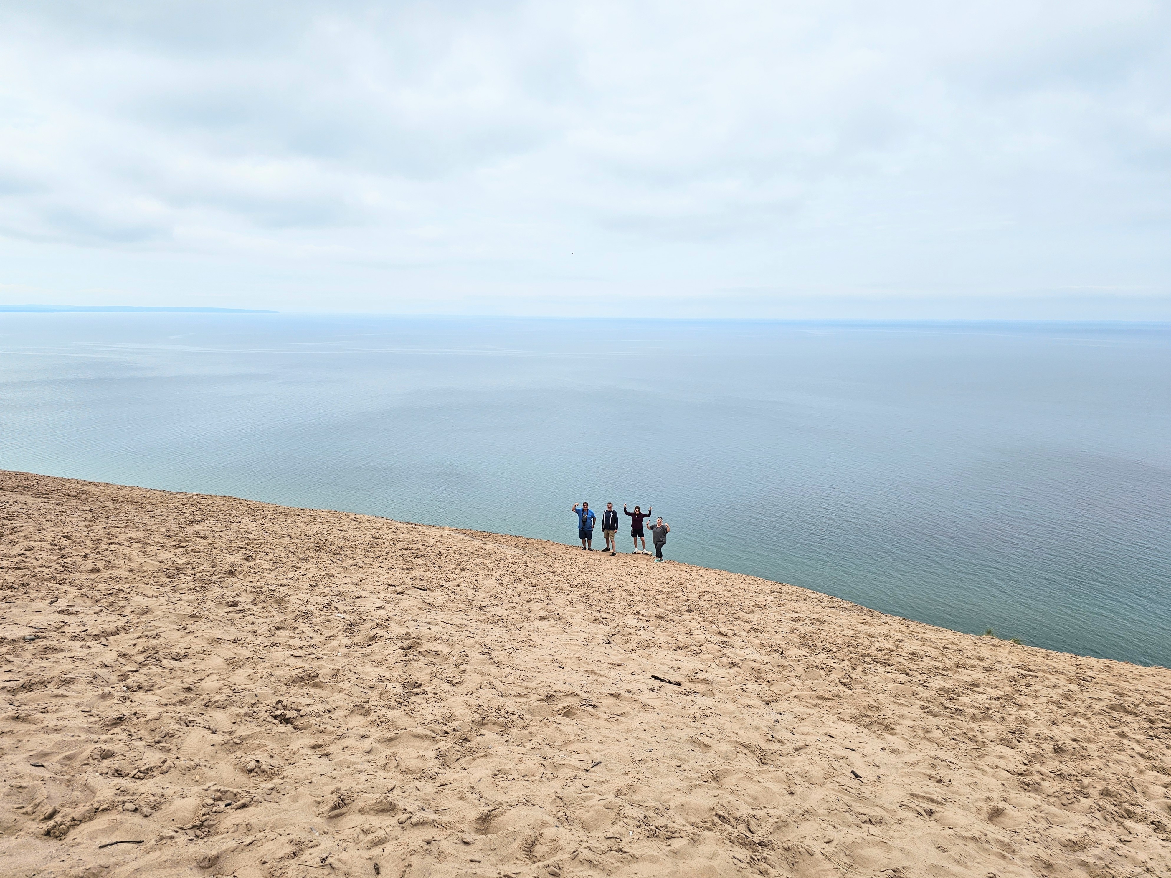 The shoreline at the base of this tall sand dune is almost vertically straight down from a level area that you enter near the parking area. We could only see a clear beach view, far below us, from a trail to the left side of the dune. People who had made the trek down to the beach were teeny tiny, ant-sized specks from where we stood!